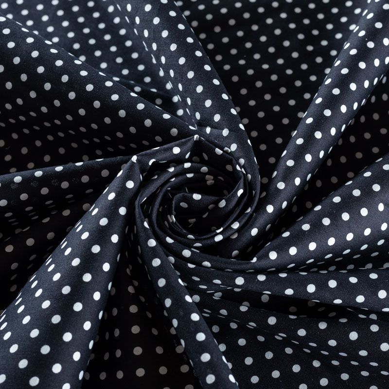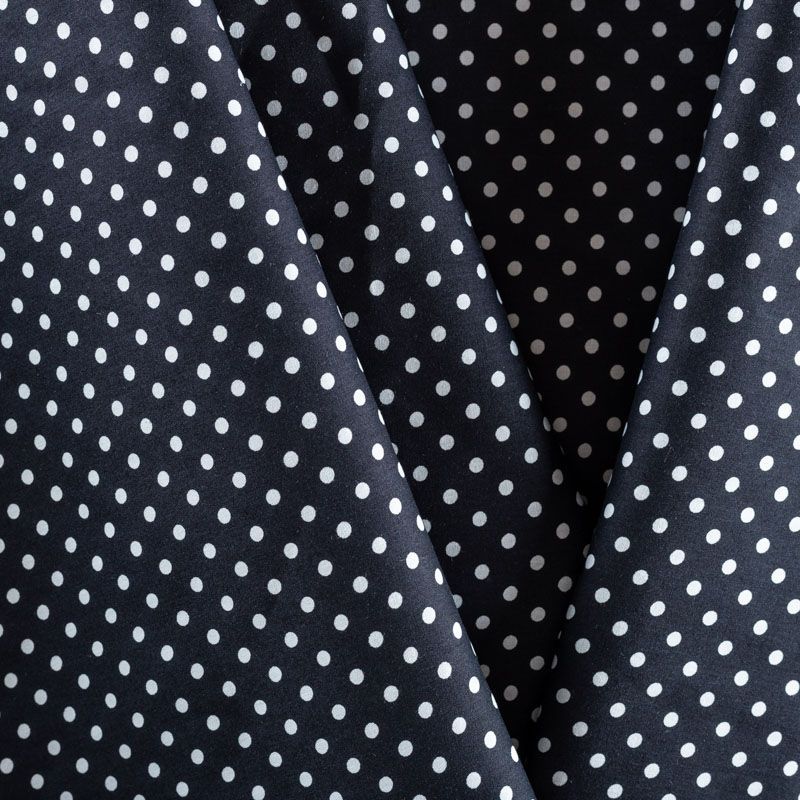 Плательно-блузочная ткань из натурального хлопка в белый горошек. Ткань легкая, тонкая, хорошо "дышит", мягкая, не прозрачная. Подойдет для пошива летнего платья, летящей юбки, блузы, сарафана, комбинезона или рубашки.