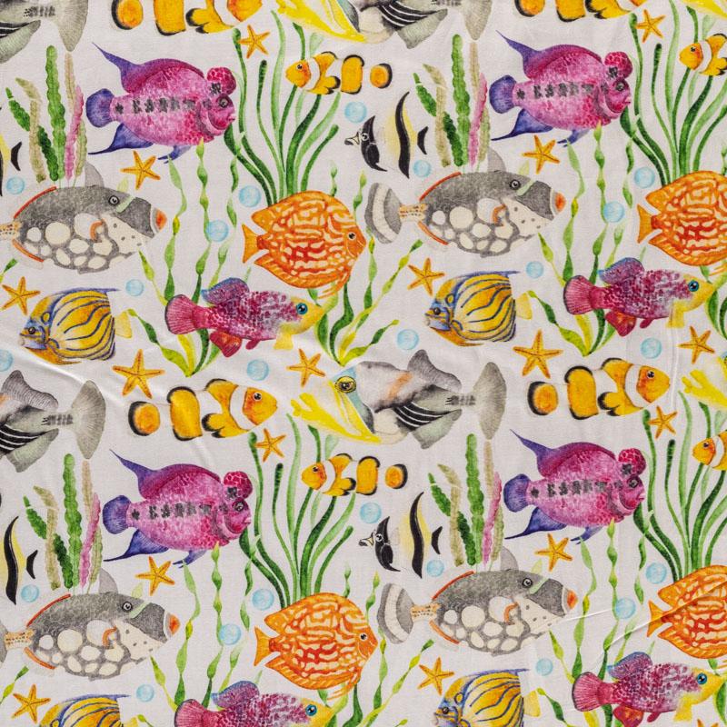 Итальянский натуральный хлопок с ярким принтом в виде морских обитателей. Ткань легкая, тонкая, хорошо "дышит", мягкая, слегка прозрачная, по плотности напоминает батист. Подойдет для пошива домашней одежды, детских летних платьев, песочников, юбки, сарафана или рубашки, а также для для пошива постельных принадлежностей, подушек, покрывал, скрапбукинга, корзин и других видов творчества.