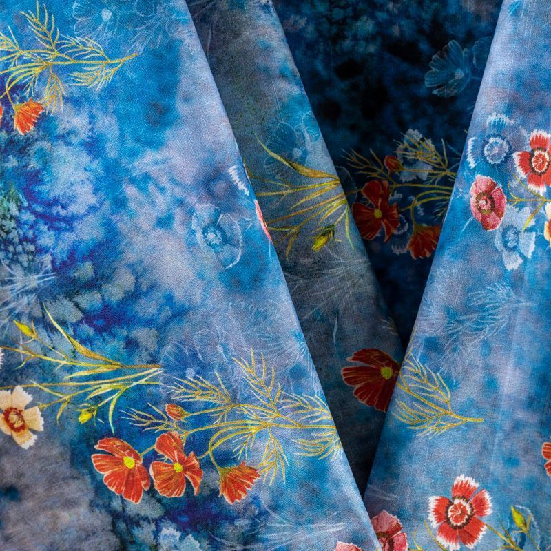 Плательно-блузочная ткань из натурального хлопка с ярким цветочным рисунком на разбеленном синем фоне. Ткань легкая, тонкая, хорошо "дышит", мягкая, слегка прозрачная, по плотности напоминает батист. Подойдет для пошива летнего платья, летящей юбки, блузы, сарафана или рубашки.