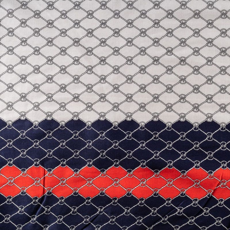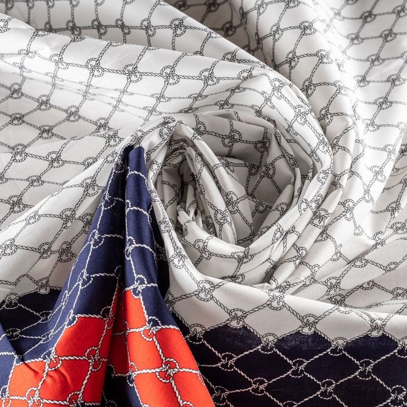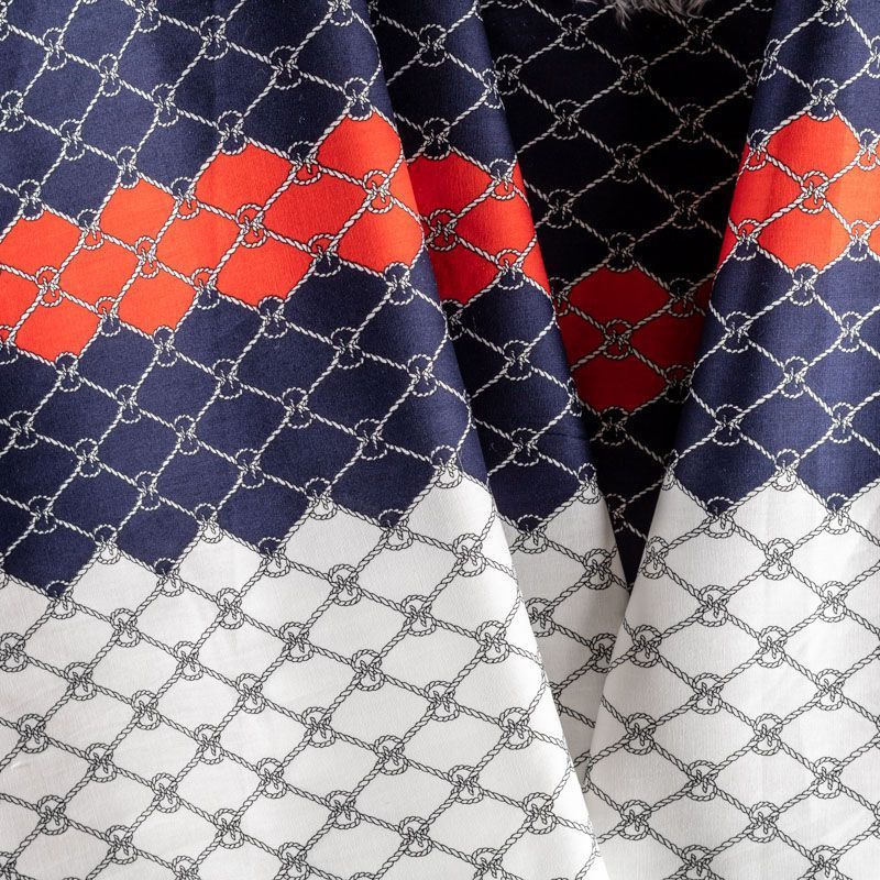 Плательно-блузочный облегченный хлопок в морской тематике. По обем сторонам кромки по всей длине полотна проходит комбинированная цветная кайма. Полотно легкое, просвечивает, очень нежное и пластичное, тянется, не держит форму. Материал отлично драпируется, формируя мягкие складки. Подойдет для прямых, полуприлегающих, расклешенных моделей платьев, сарафанов, а также юбки, туники, платье-рубашки.