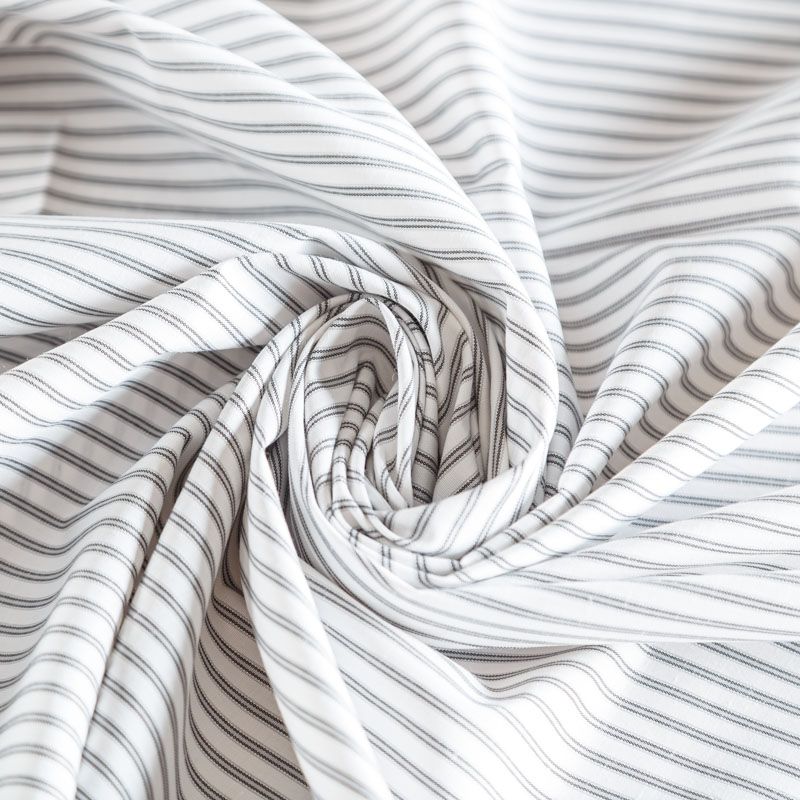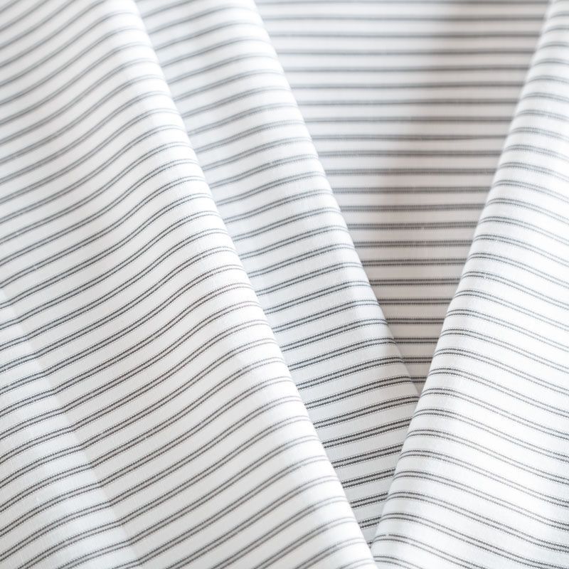 Плательно-рубашечный хлопок в белого цвета с серой полоской. Ткань мягкая, лёгкая, непрозрачная, пластичная и приятная к телу, хорошо драпируется, имеет гладкую матовую поверхность и сатиновое плетение. Прекрасно подойдет как для пошива платья-рубашки, сарафана, платьев различных фасонов, туники, топа, летнего костюма, комбинезона, мужкой и детской одежды.