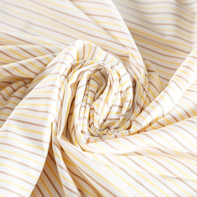 Плательно-рубашечный хлопок в белого цвета в желтую тонкую полоску. Ткань мягкая, лёгкая, непрозрачная, пластичная и приятная к телу, хорошо драпируется, имеет гладкую матовую поверхность и сатиновое плетение. Прекрасно подойдет как для пошива платья-рубашки, сарафана, платьев различных фасонов, туники, топа, летнего костюма, комбинезона, мужкой и детской одежды.