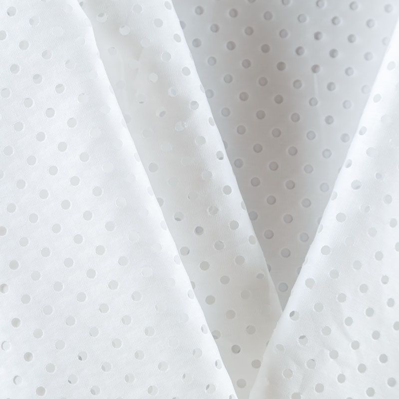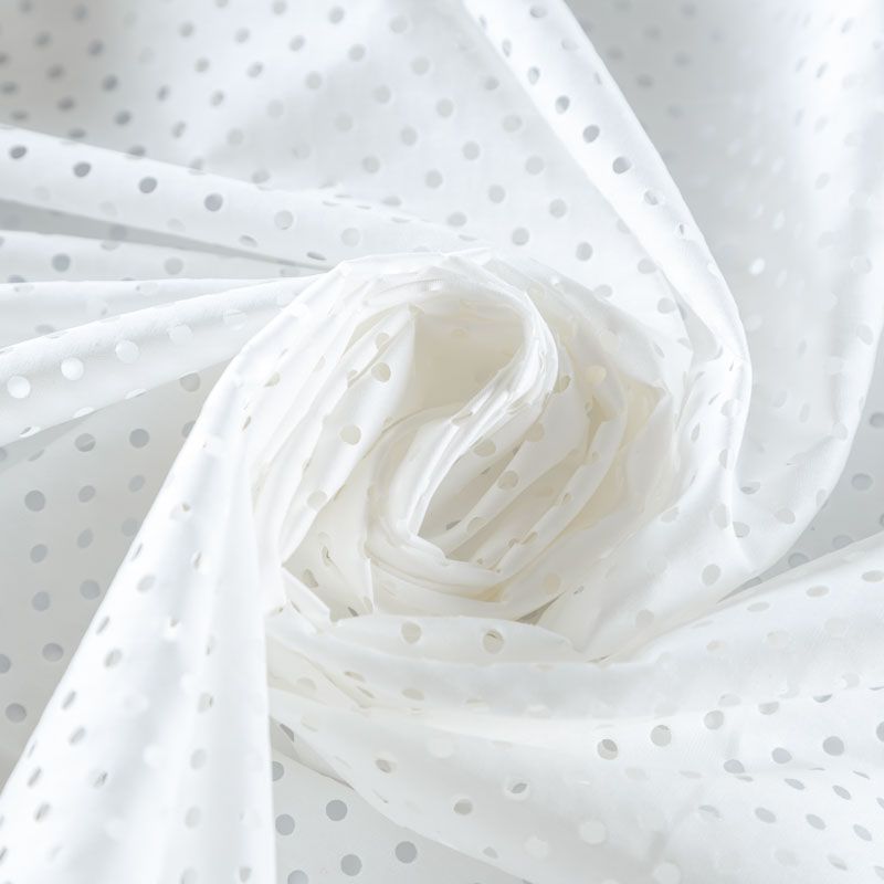 Однотонный гладкокрашенный плательно-рубашечный хлопок декорирован лазерной перфорацией, размер отверстия - 3 мм. Ткань лёгкая, прозрачная за счет структуры, поверхность матовая, гладкая, приятная к телу, хорошо драпируется. Прекрасно подойдет для пошива блузы, платья-рубашки, летнего сарафана, туники, топа, юбки, шорт на подкладе.