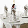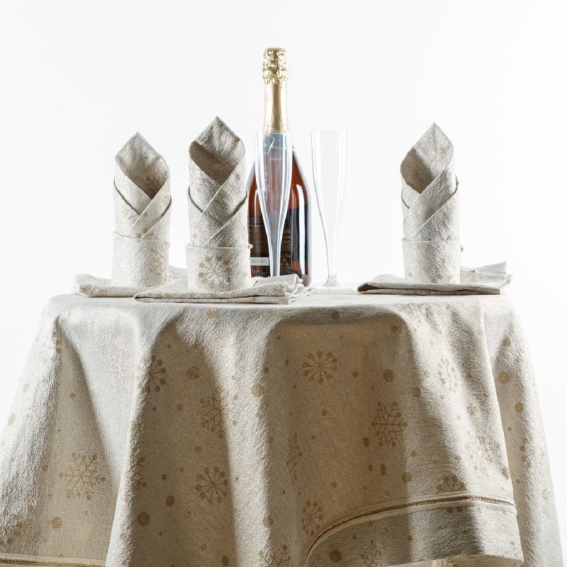 Столовый подарочный набор из смесовой хлопковой ткани натурального льняного оттенка с золотистым декором. Комплект состоит из одной прямоугольной скатерти - 160х130 см и салфеток на 6 персон размером 35х35 см.
