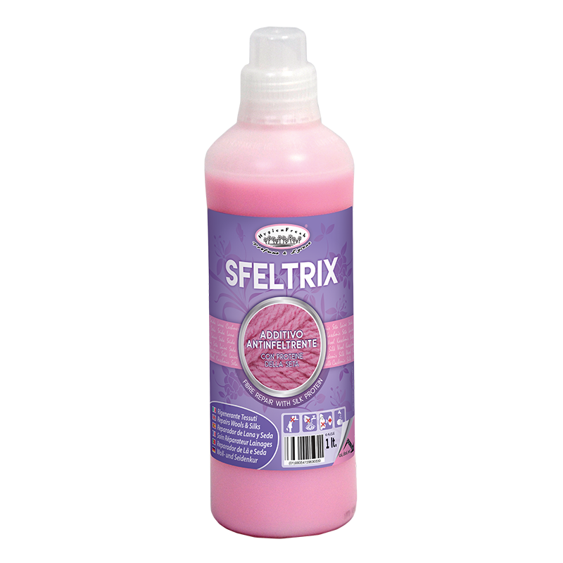 Добавка на основе протеина шелка, которая защищает шерстяные изделия и предотвращает валяние шерсти. Содержит протеины шелка, которые питают волокна шерсти. Создает защитный слой на волокнах одежды. Это дает мягкое и ни с чем не сравнимое прикосновение. Восстановит 1-2 утраченных размера за счет валяния из шерсти. При ежедневном использовании предотвращает возможное валяние шерсти. Hygienfresh® Sfeltrix используется во время последнего полоскания с ограниченным уровнем воды.