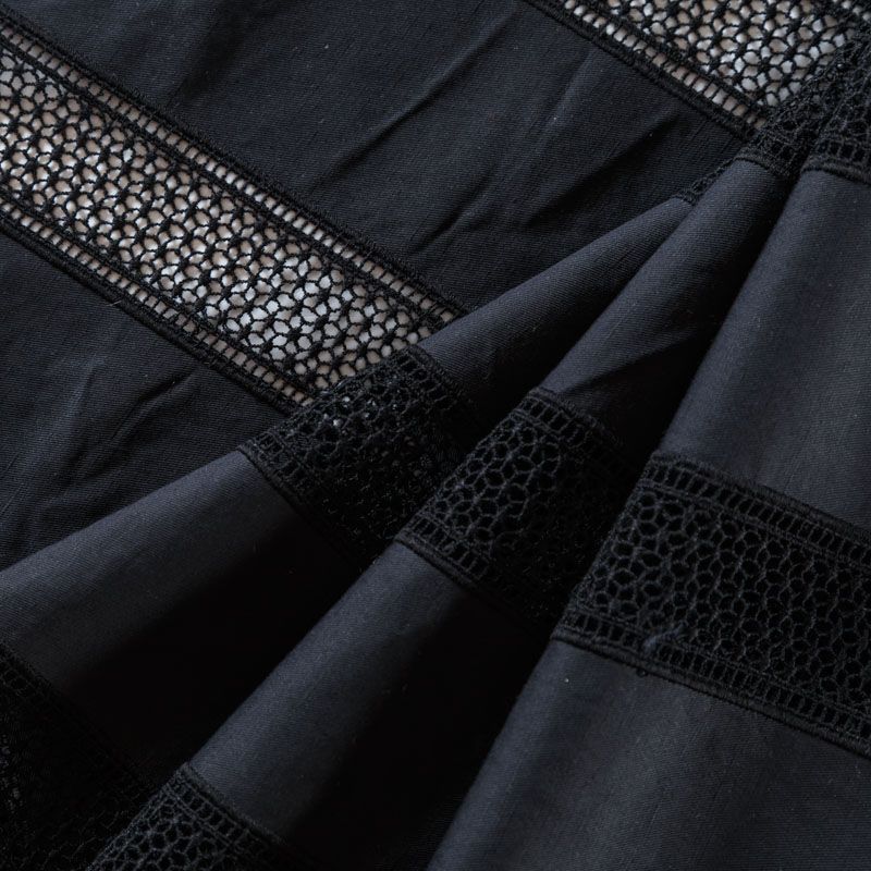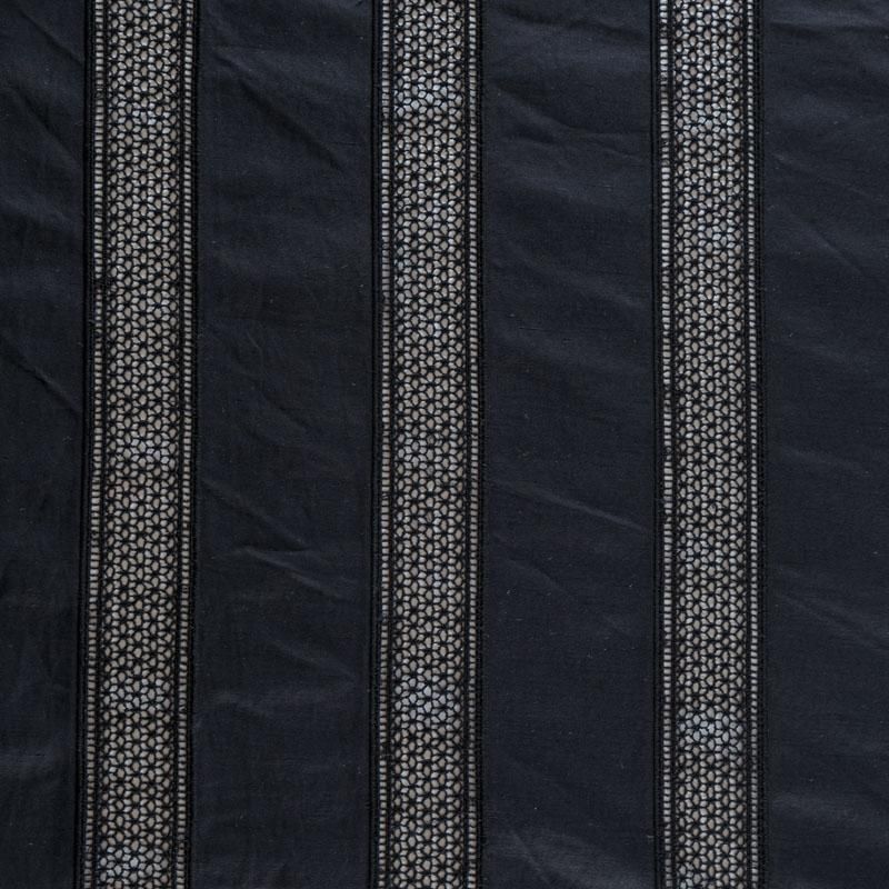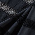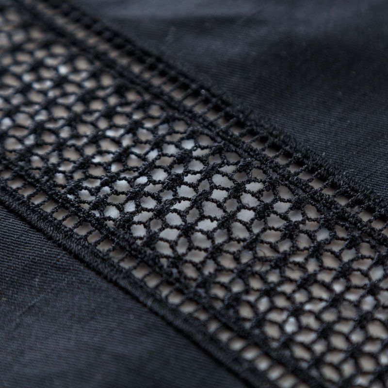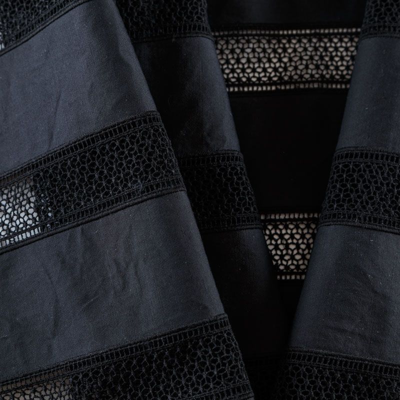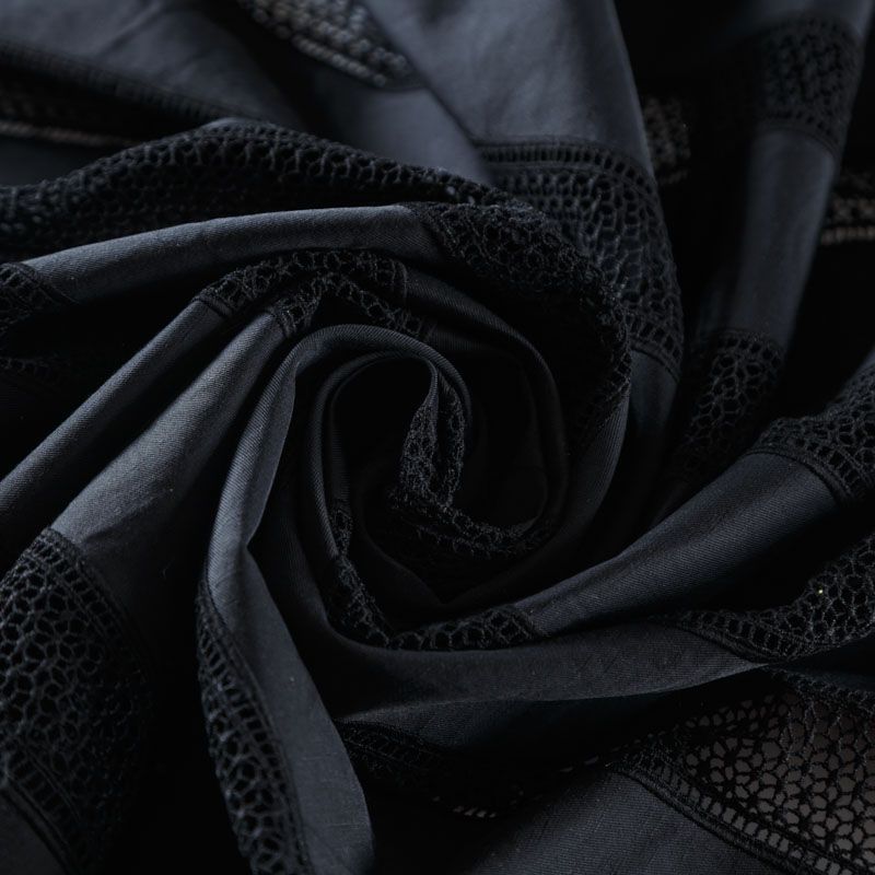Итальянская хлопковая ткань средней плотности черного цвета. Оригинальность, воздушность коттону придает вышивка-мережка в виде вертикальных полос по длине ткани. Материал очень приятный на ощупь, эластичный, не жесткий, но держит форму. Подойдет для пошива куртки, парки, тренча, легкого жакета, юбки, джоггеров, шорт, платья-сафари и других изделий.