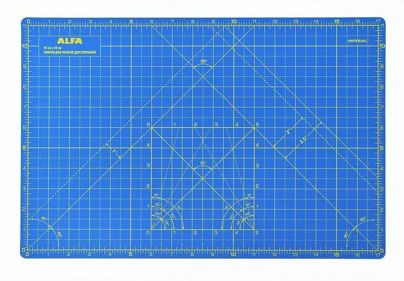 Коврик раскройный двусторонний ALFA 45*30 см предназначен для нарезания ткани и подравнивания блоков при работе в технике пэчворк. Используется совместно с дисковым ножом и специализированными линейками. Поверхность коврика разработана таким образом, что на ней не остается следов от разрезов. Раскройный коврик ALFA имеет две рабочие поверхности и двустороннюю разметку: сантиметровую на одной стороне и дюймовую на другой. Дополнительно указаны углы на 45 и 60 градусов. Выполнен из первичного материала. Не содержит элементов вторичной обработки.