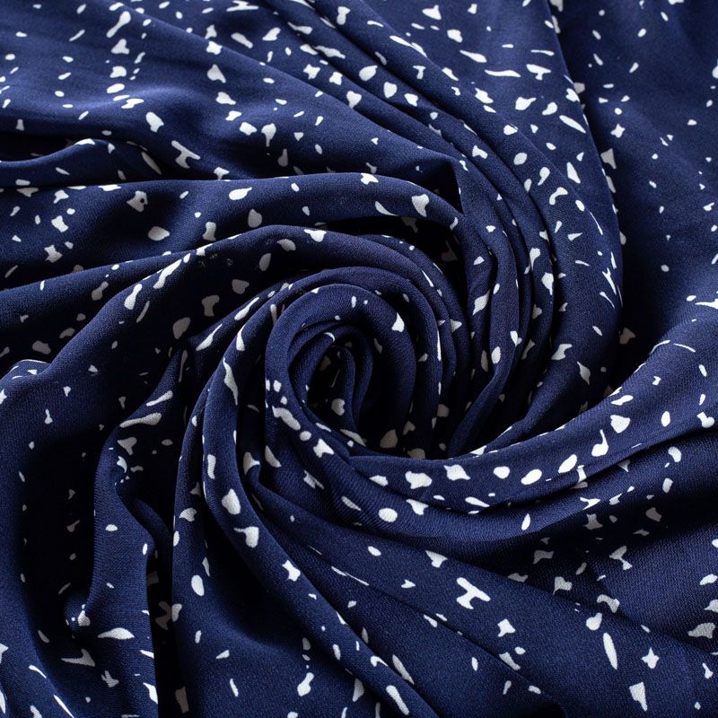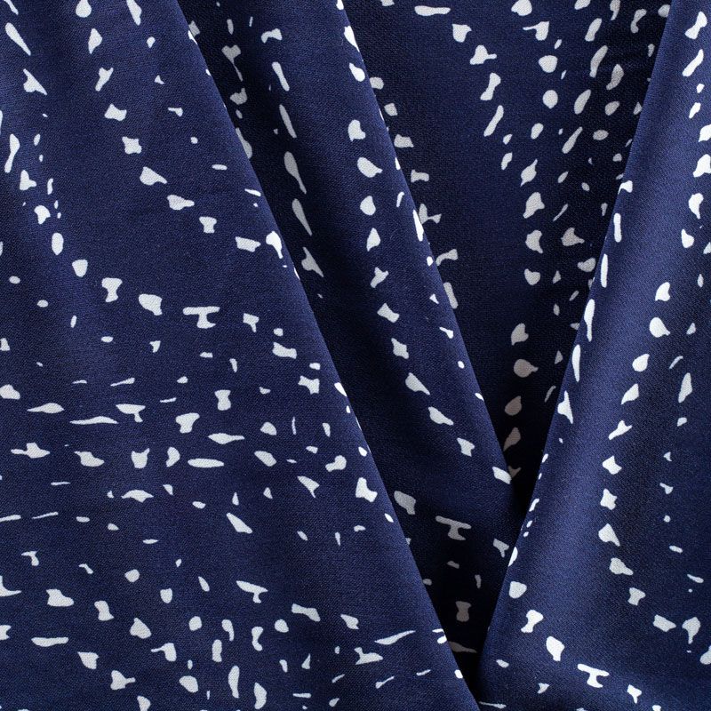 Плательный креп с принтом в мелкий горох. Ткань средней плотности, не толстая, пластичная, поверхность полотна матовая, с характерной мелкозернистой фактурой, прочная, практически не мнется, хорошо драпируется. Превосходно подойдет для пошива стильного костюма, юбки, платья, комбинезона, топа, брюк.