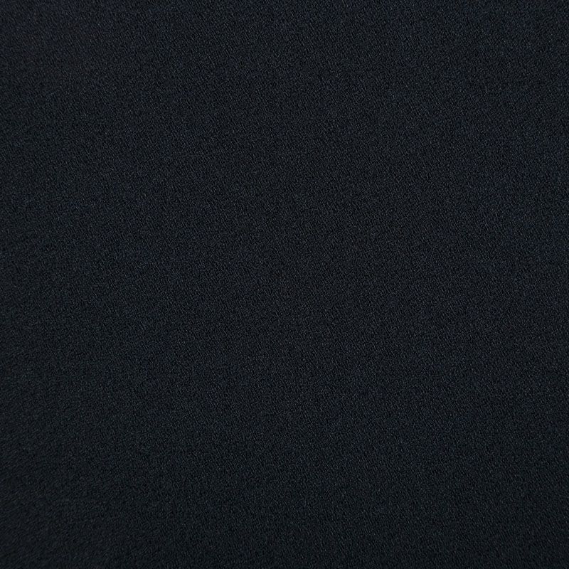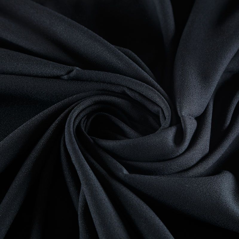 Вискозный креп костюмно-плательной плотности в черном оттенке, поверхность матовая, слегка зернистая. Ткань мягкая, пластичная, образует мягкие фалды, не просвечивает, тянется за счет эластана в составе. Подойдет для пошива весенне-осеннего костюма, платья, комбинезона, юбки, брюк