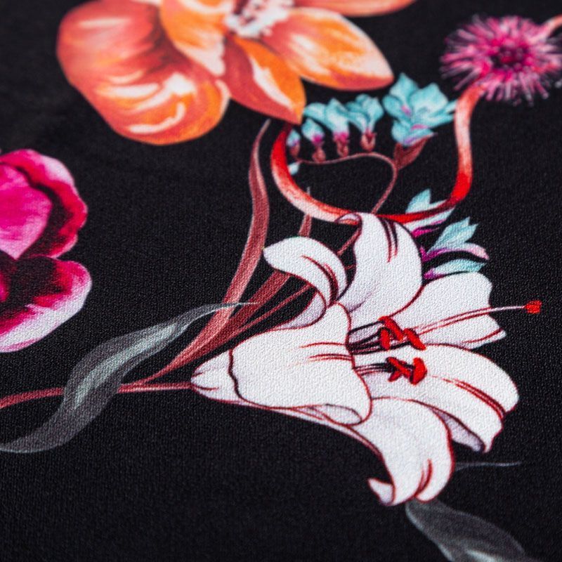 Итальянский смесовый креп плательной плотности глубокого черного цвета с красивым цветочным принтом. Поверхность матовая и фактурная, ткань малосминаемая, тянется за счет эластана в составе, красиво драпируется, струится и дает объемную складку, не просвечивает.Идеально подойдет для шикарного платья, блузы, юбки, комбинезона, брюк свободного кроя.