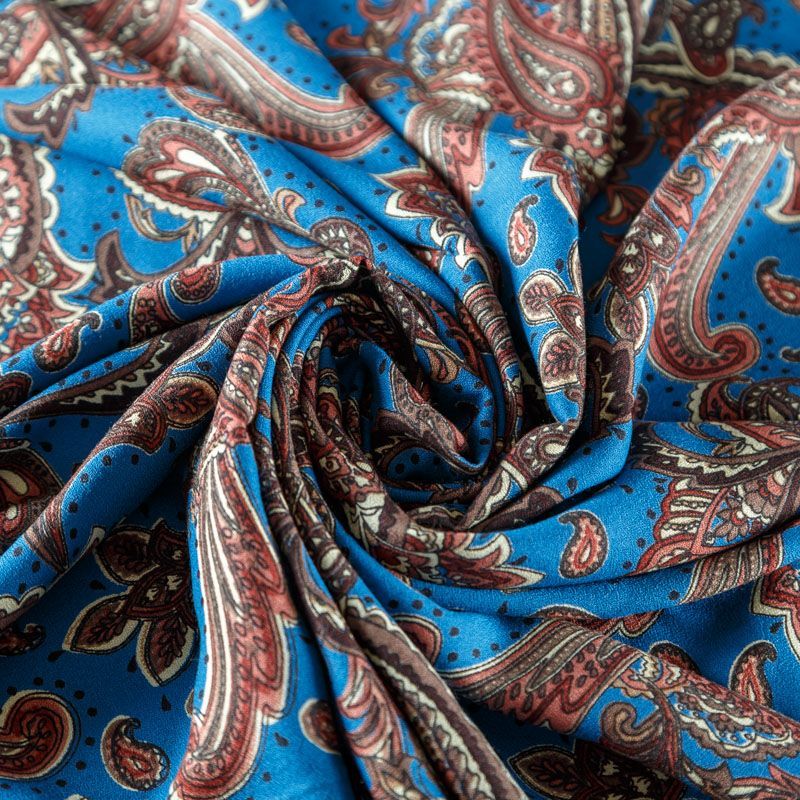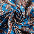 Плательный вискозный креп с узором пейсли на сине-голубом фоне. Материал приятный и комфортный в носке, не мнется и не прозрачен на свету, имеет мелкозернистую матовую поверхность. Идеально подойдет для пошива платья, юбки, широких брюк, комбинезона, блузки, топа или туники.