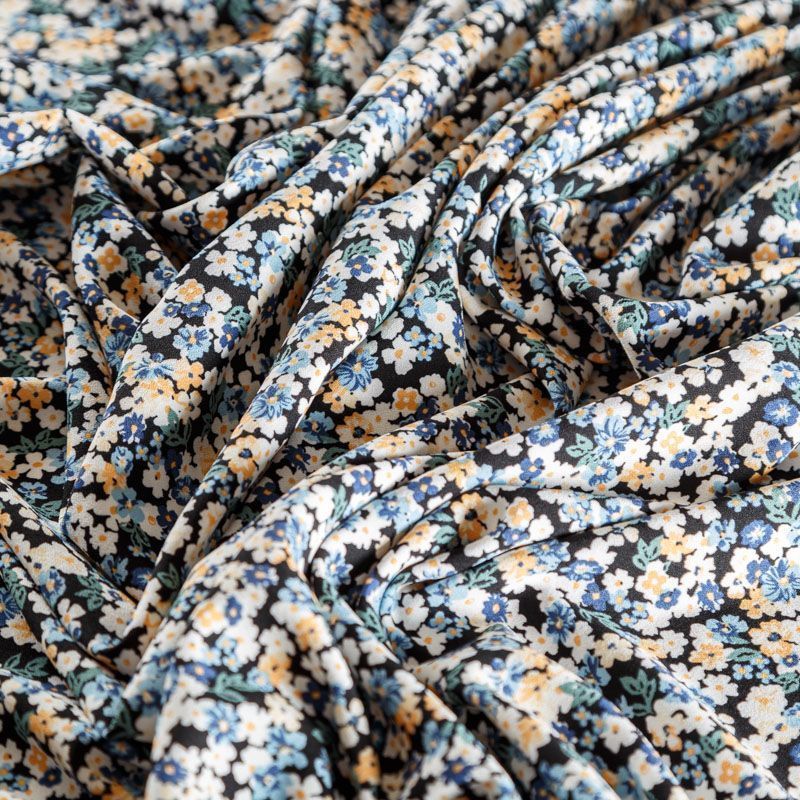 Плательный креп с трендовым уже не первый сезон мелкоцветным принтом на черном фоне, приятный и комфортный в носке, не мнется и не прозрачен на свету, имеет мелкозернистую матовую поверхность, тянется за счет эластана в составе. Идеально подойдет для пошива платья, юбки, широких брюк, комбинезона, блузки, топа или туники.