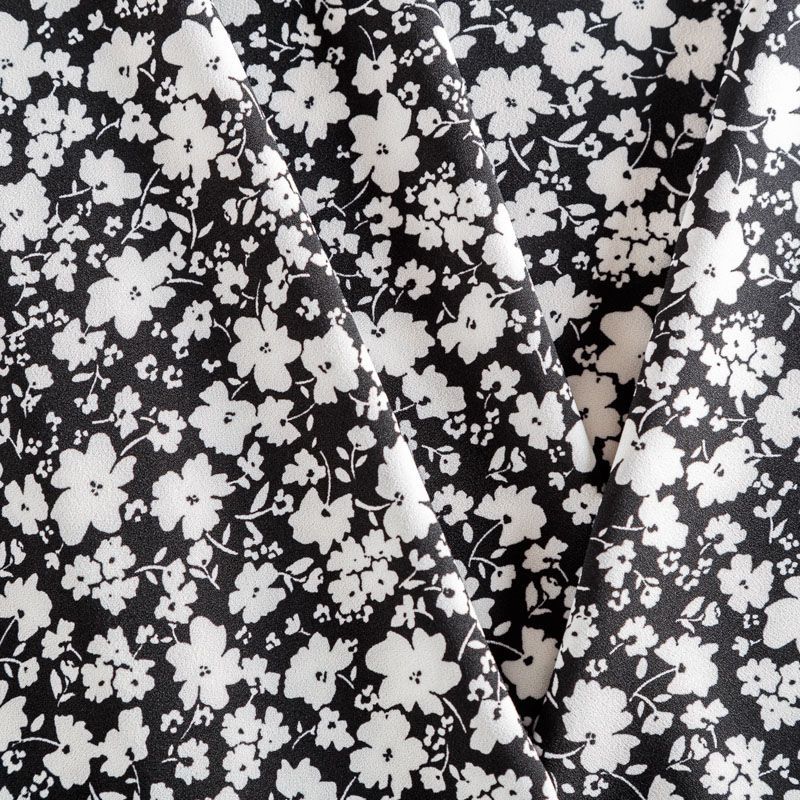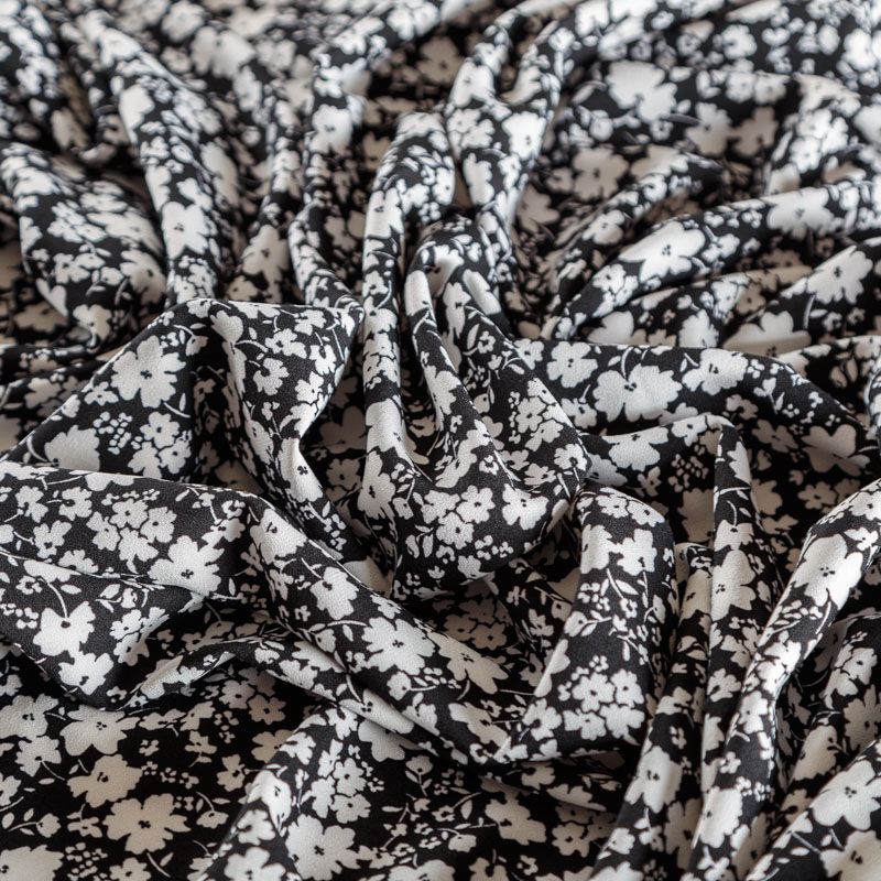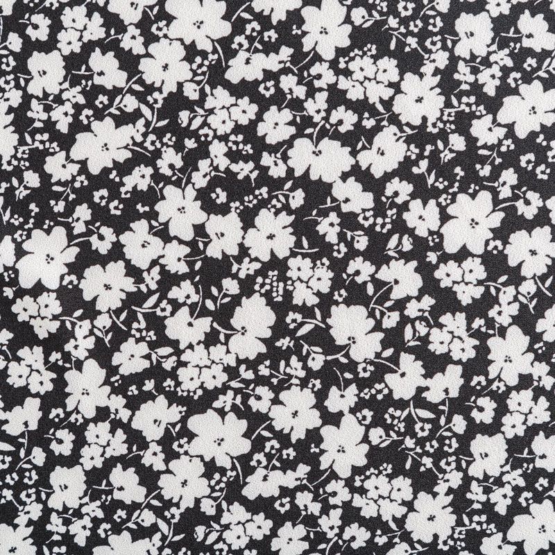 Плательный креп с трендовым уже не первый сезон мелкоцветным принтом на черном фоне, приятный и комфортный в носке, не мнется и не прозрачен на свету, имеет мелкозернистую матовую поверхность, тянется за счет эластана в составе. Идеально подойдет для пошива платья, юбки, широких брюк, комбинезона, блузки, топа или туники.