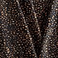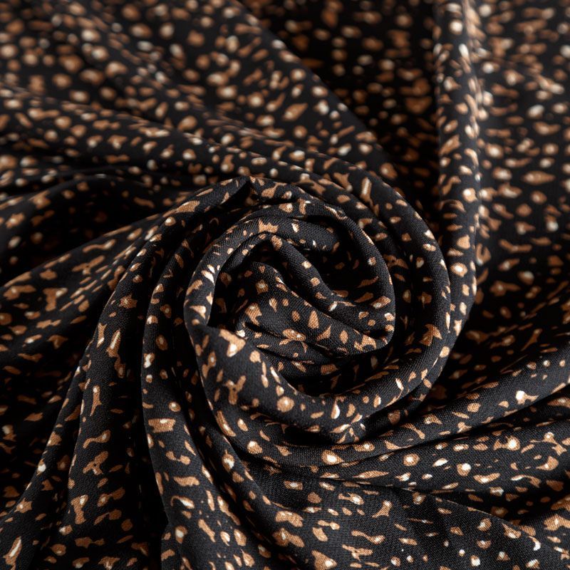 Плательный креп со стилизованным анималистическим принтом на черном фоне, приятный и комфортный в носке, не мнется и не прозрачен на свету, имеет мелкозернистую матовую поверхность, тянется за счет эластана в составе. Идеально подойдет для пошива платья, юбки, широких брюк, комбинезона, блузки, топа или туники.