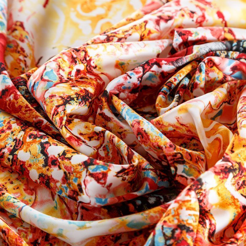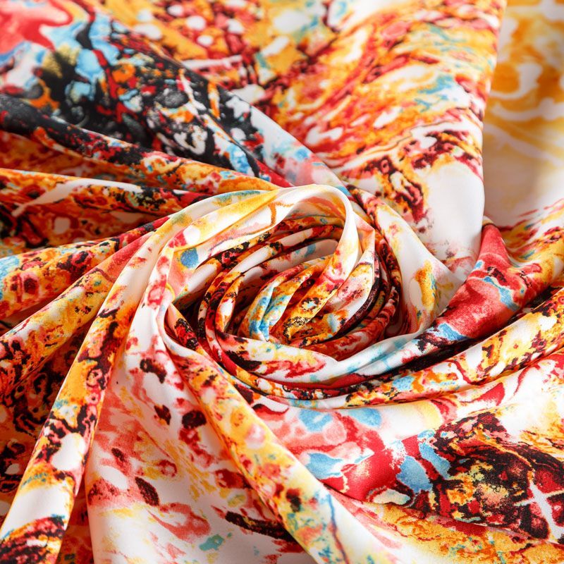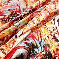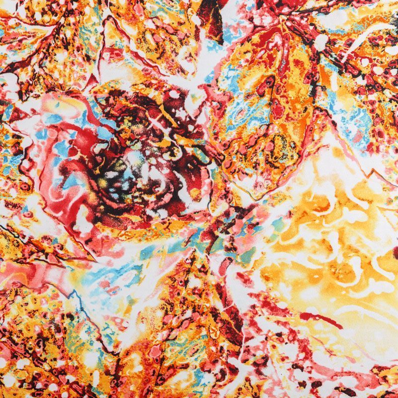 Плательный креп с абстрактным принтом. Ткань средней плотности, не толстая, пластичная, поверхность полотна матовая, с характерной мелкозернистой фактурой, прочная, практически не мнется, хорошо драпируется. Превосходно подойдет для пошива стильного костюма, юбки, платья, комбинезона, топа, брюк.