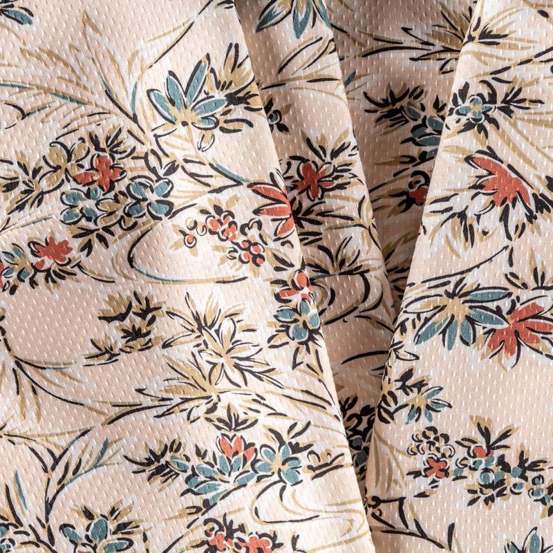Красивое сочетание оттенков, на сливочном фоне растительный принт в бирюзово-терракотовых тонах. Легкая, пластичная, шелковистая ткань с фактурным мелким узором. Не просвечивается. Мягкая, отлично драпируется и струится. Подойдет для пошива платья и сарафана, юбки, блузки, туники, топа, комбинезона с брюками или шортами, платье-халата.