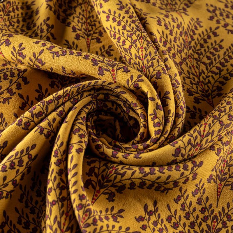Плательно-блузочная ткань из вискозы с креповым плетением. Ткань средней плотности, имеет зернистую фактуру и матовую поверхность, практически не просвечивает, пластичная, хорошо драпируется мягкими складками, струится. Подходит для пошива платья и сарафана, юбки, блузки, туники, топа, комбинезона.