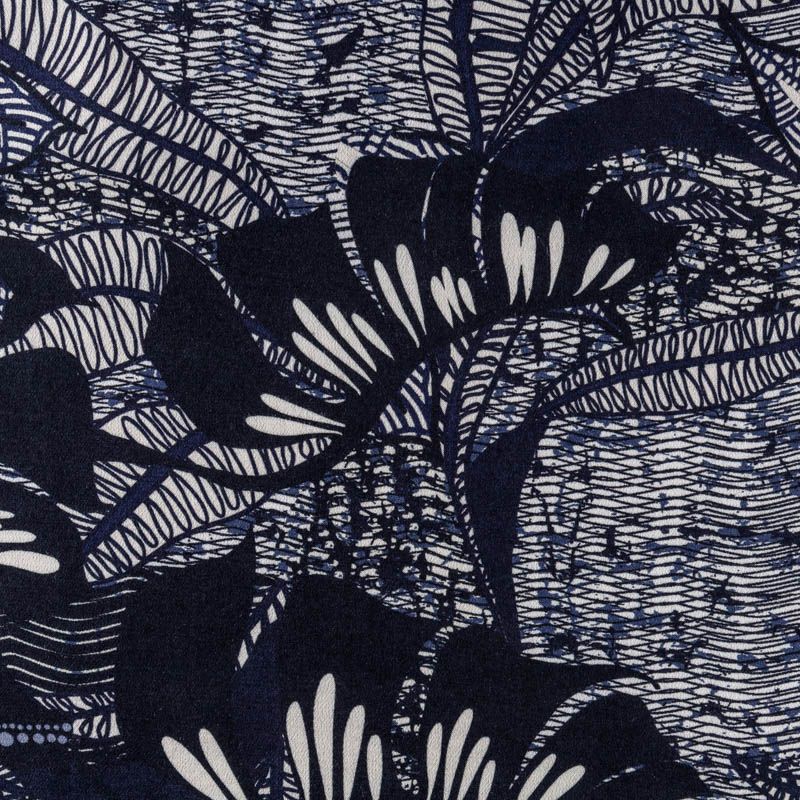 Натуральная вискозная ткань с абстрактным принтом в синих оттенках. Легкая, хорошо тянется, драпируется струящимися складками, приятная и комфортная в носке. Идеально подходит для пошива платьев, юбок, блуз, комбинезонов. Материал слегка мнется и прозрачен на свету, имеет креповую фактуру.