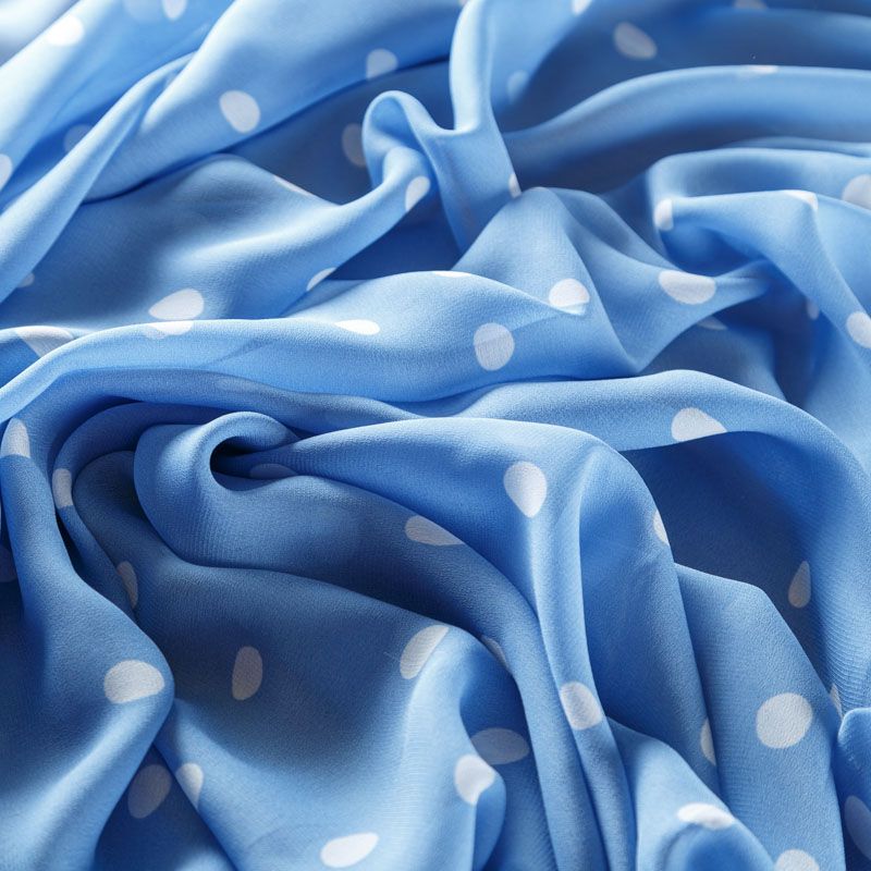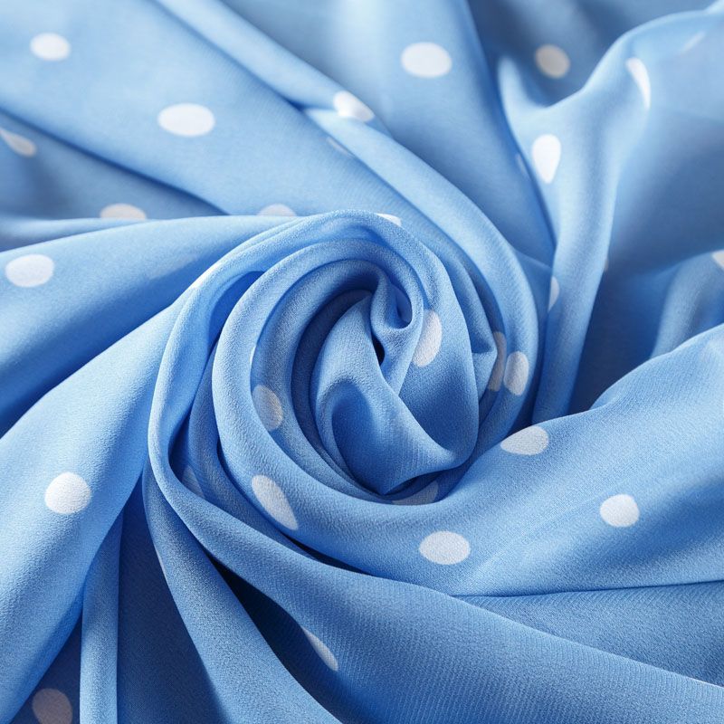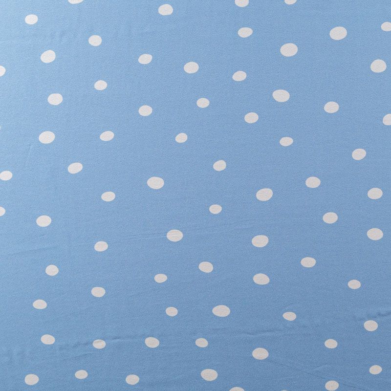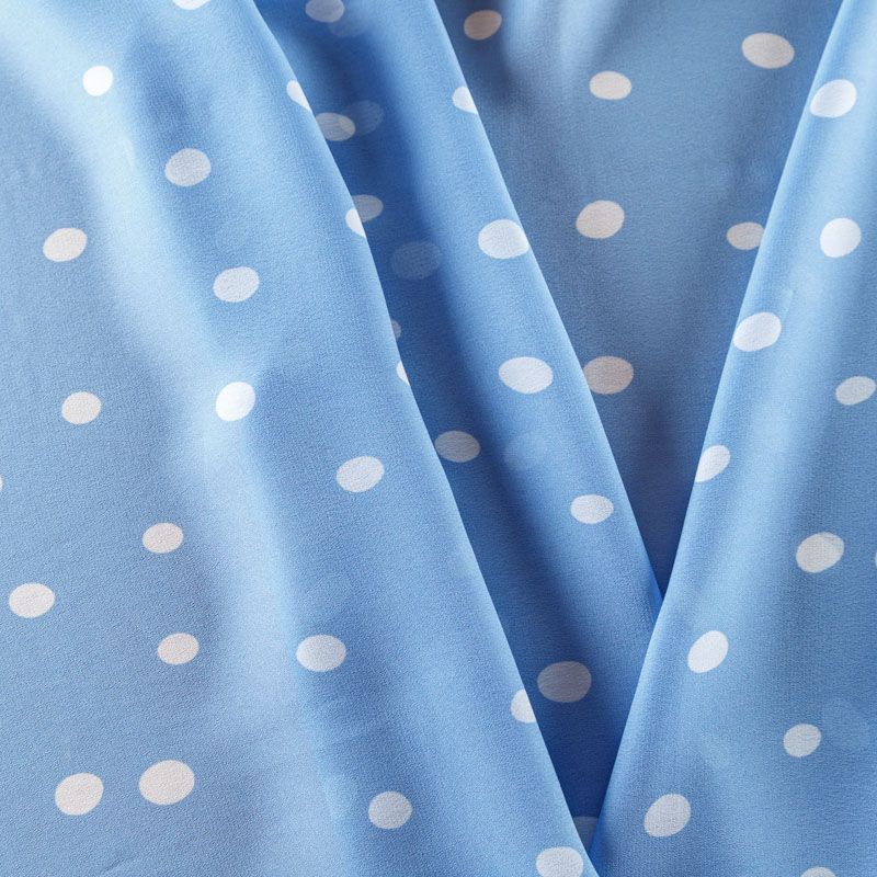 Итальянский вискозный креп-шифон в небесно-голубом оттенке в белый горох легкий, воздушный, мягкий и нежный, прекрасно драпируется, приятен к телу, прозрачный, требуется подклад. Идеален для нежных платьев летящих силуэтов, топов, туник, блузок, юбок  с роскошными драпировками и воланами.