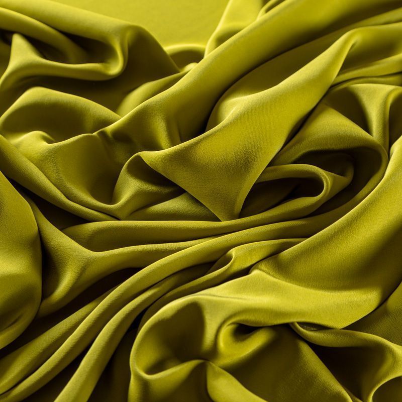 Итальянский натуральный шелковый крепдешин в красивом желто-зеленом оттенке, слегка просвечивает, легкий и струящийся, отлично драпируется. Идеально подойдет для пошива платьев и сарафанов расклешенных моделей, с воланами, летящих юбок, топов, блузки, юбки, широких брюк, костюма в пижамном стиле.