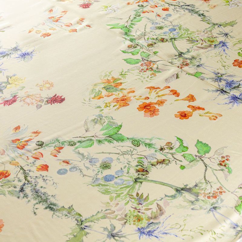 Итальянский натуральный крепдешин с акварельным цветочным  принтом на фоне дынного оттенка, тонкий, слегка прозрачный, отлично драпируется, легкий и струящийся с креповой поверхностью. Идеально подойдет для пошива платьев и сарафанов расклешенных моделей, с воланами, летящих юбок, топов, блузки, костюма в пижамном стиле.