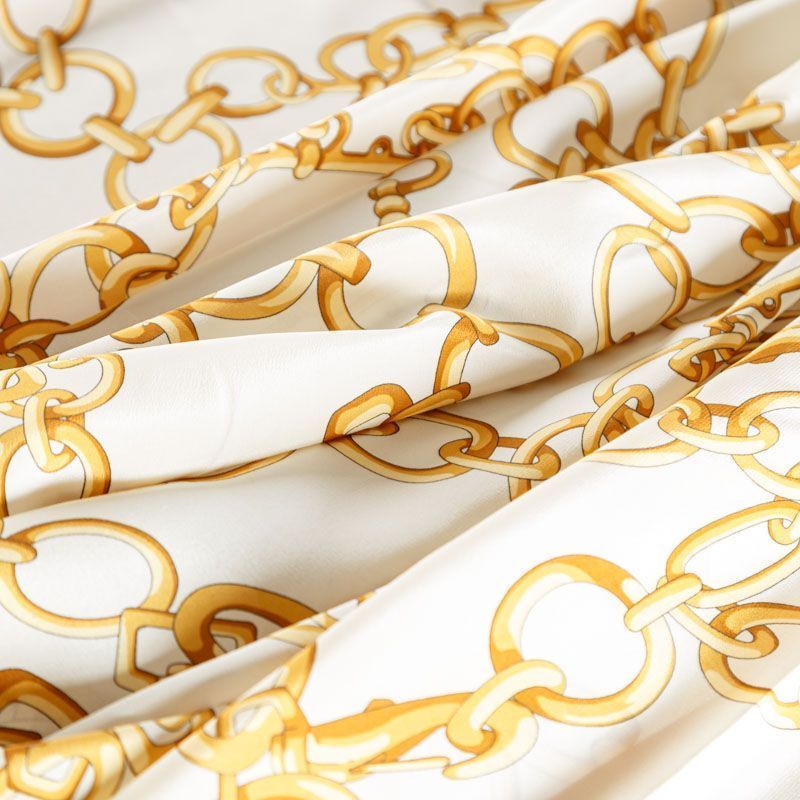 Итальянский натуральный крепдешин в молочном оттенке с золотыми цепочками, тонкий, слегка прозрачный, отлично драпируется, легкий и струящийся. Идеально подойдет для пошива платьев и сарафанов расклешенных моделей, с воланами, летящих юбок, топов, блузки, юбки, широких брюк, костюма в пижамном стиле.