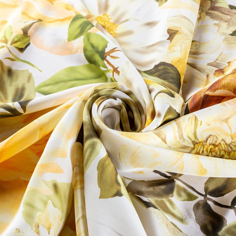 Натуральный шелковый крепдешин с матовой поверхностью, легкий, струящийся, хорошо драпируется. Цветочный принт выполнен бежево-оливковой гамме на белом фоне. Крепдешин прекрасно подойдет для пошива летнего сарафана, платья, блузки, костюма в пижамном стиле, широких брюк или юбки.
