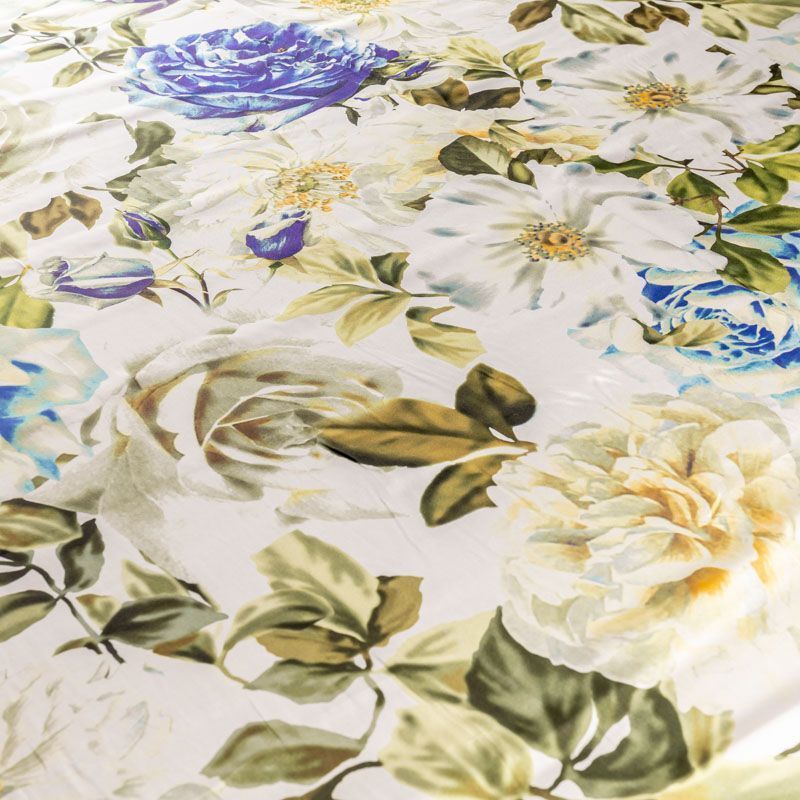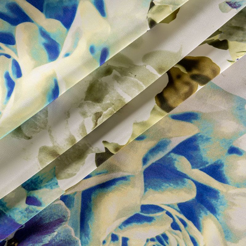 Натуральный шелковый крепдешин с матовой поверхностью, легкий, струящийся, хорошо драпируется.  Цветочный принт в сине-зеленых оттенкам будет уместен для пошива летнего сарафана, платья, блузки, костюма в пижамном стиле, широких брюк или юбки.