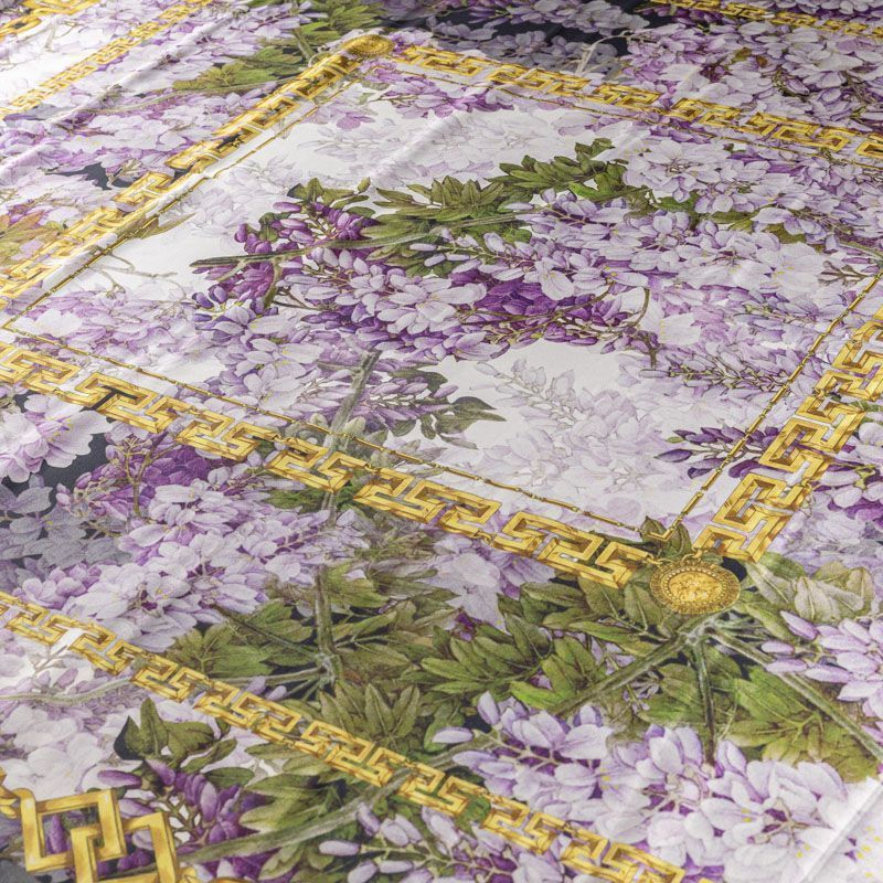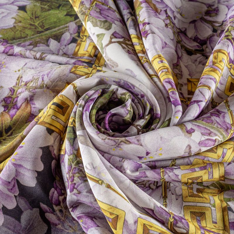 Натуральный шелковый платочный купон с матовой поверхностью, легкий, струящийся, хорошо драпируется. Цветочный принт выполнен в приглушенных оттенках и дополнен акцентными золотыми цепями-рамками. В целом купон выглядит очень сдержанно и элегантно, поэтому станет отличным вариантом для