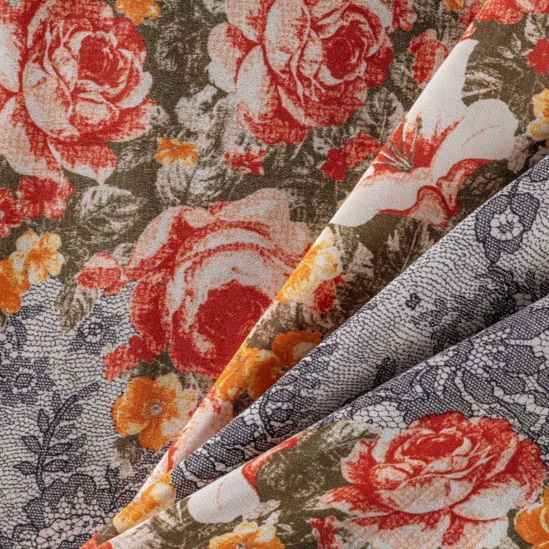 Натуральный шелковый крепдешин с матовой поверхностью, легкий, струящийся, хорошо драпируется. Изысканное сочетание яркого цветочного принта в красно-желтых оттенках с имитацией черного тонкого кружева подойдет для пошива летнего сарафана, платья, блузки, костюма в пижамном стиле, широких брюк или юбки.