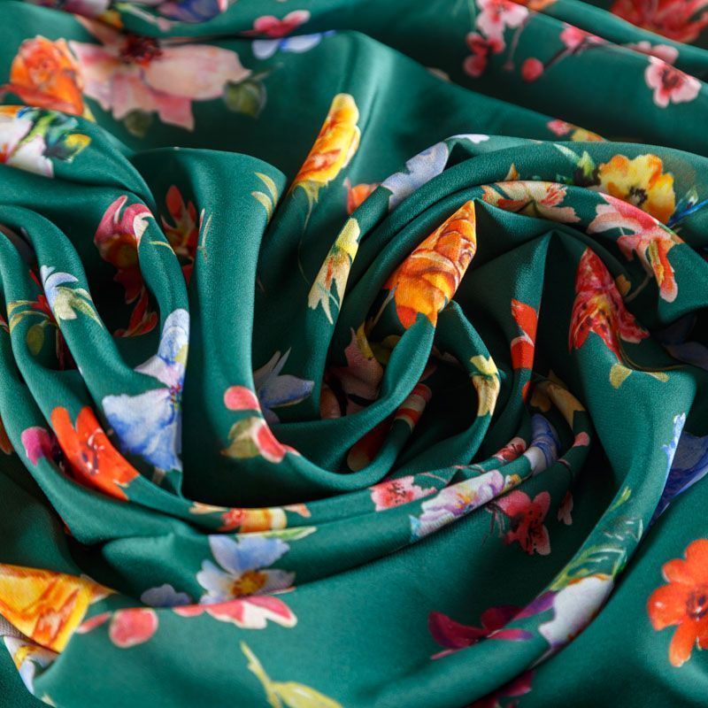 Итальянский крепдешин с матовой лицевой поверхностью с цветочным принтом на зеленом фоне, тонкий, слегка прозрачный, отлично драпируется, легкий и струящийся. Идеально подойдет для пошива платьев и сарафанов расклешенных моделей, с воланами, летящих юбок, топов, блузки, костюма в пижамном стиле.