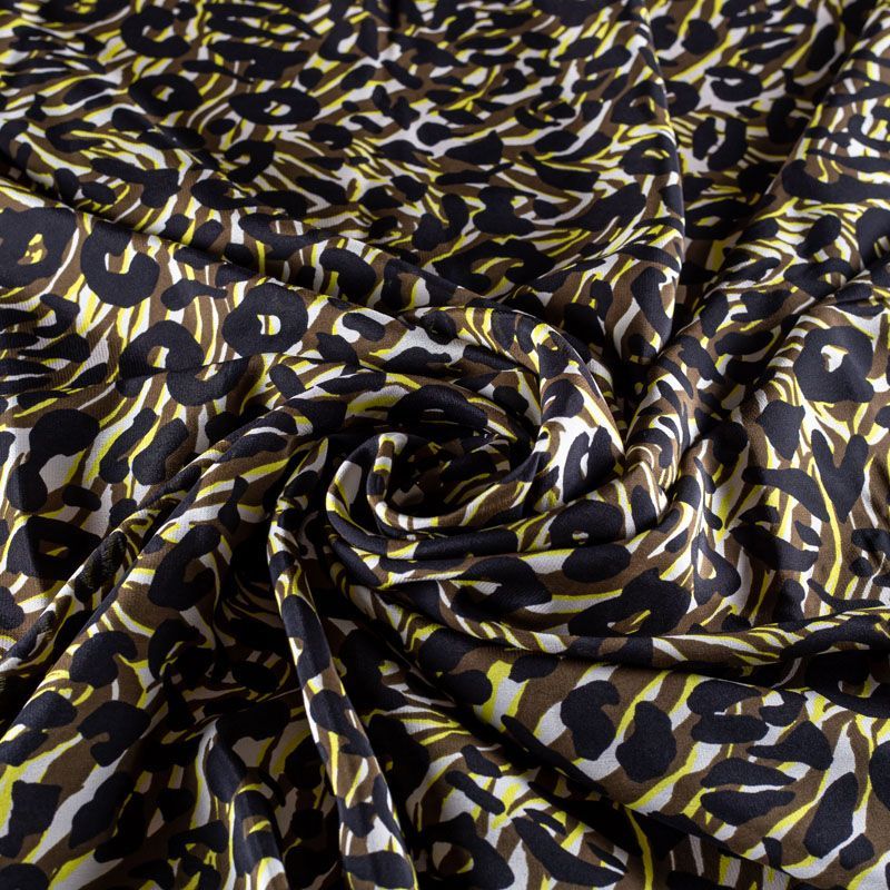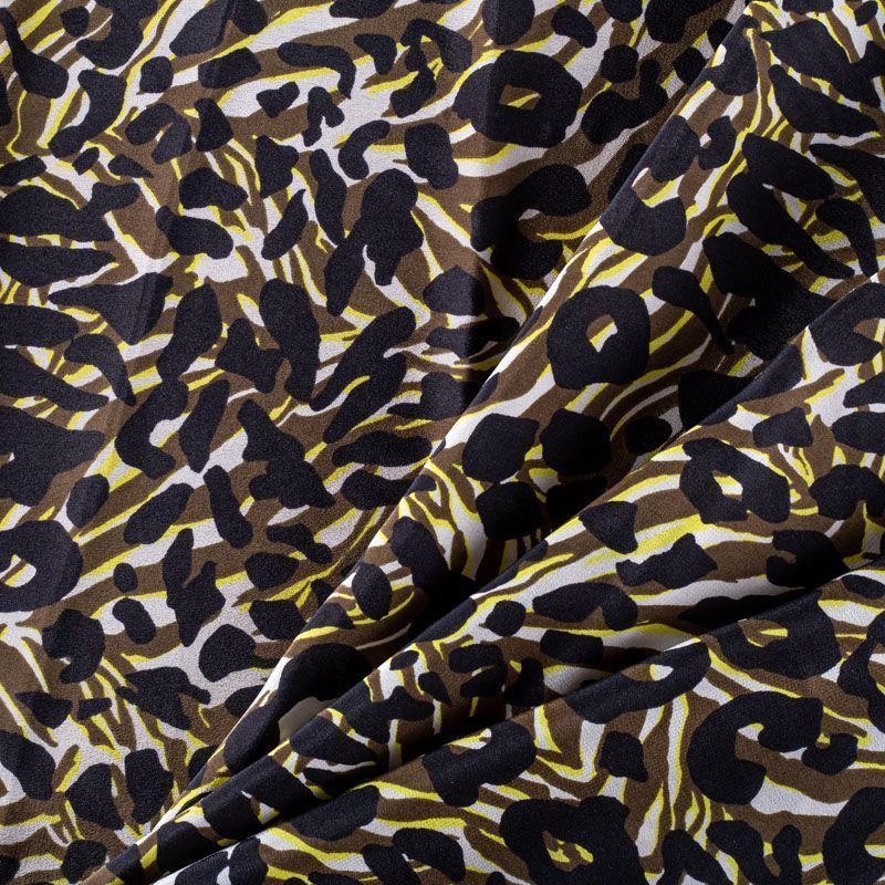 Натуральный шелковый крепдешин с матовой поверхностью, легкий, струящийся, хорошо драпируется. Сочетание анималистического и "милитари" принтов прекрасно подойдет для пошива летнего сарафана, платья-рубашки, топа, блузки, костюма в пижамном стиле, широких брюк, комбинезона или юбки.