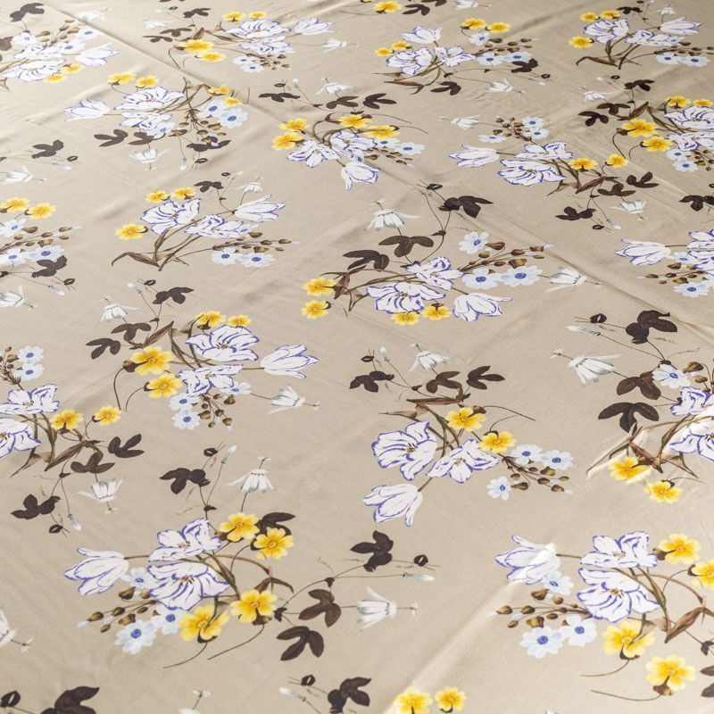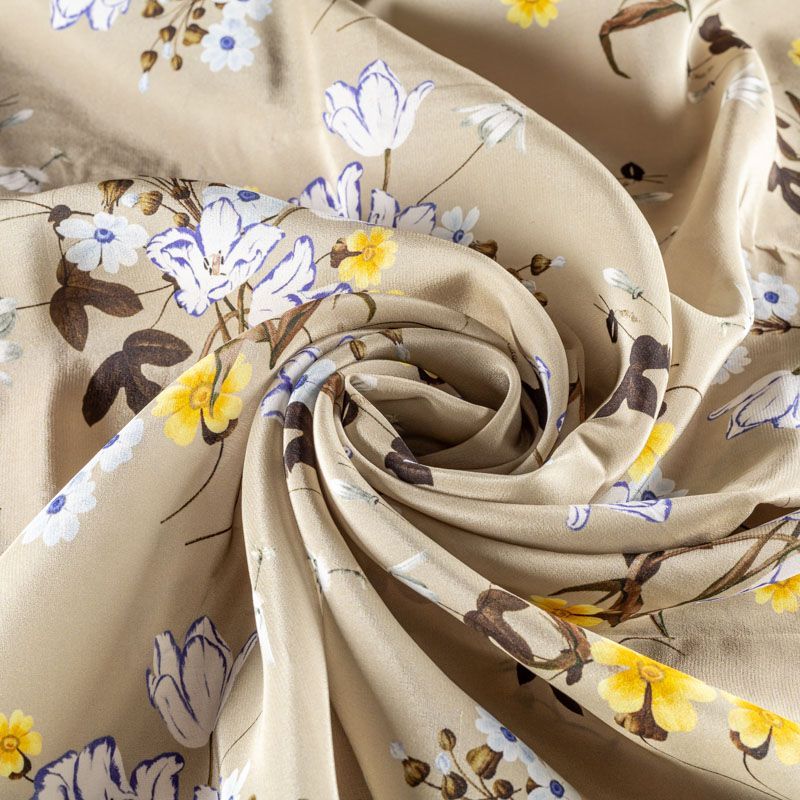 Натуральный шелковый крепдешин с матовой поверхностью, легкий, струящийся, хорошо драпируется. Нежный цветочный принт на спокойном оливковом фоне будет уместен для пошива летнего сарафана, платья, блузки, костюма в пижамном стиле, широких брюк или юбки.