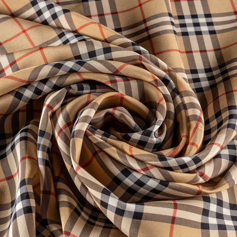 Тонкая шелковая ткань с узнаваемым принтом представляет собой крупную клеточку на золотисто-бежевом фоне. Этот крепдешин почти не просвечивает, хорошо драпируется, имеет матовую креповую поверхность. Идеально подойдет для пошива блузы, платья и юбки.