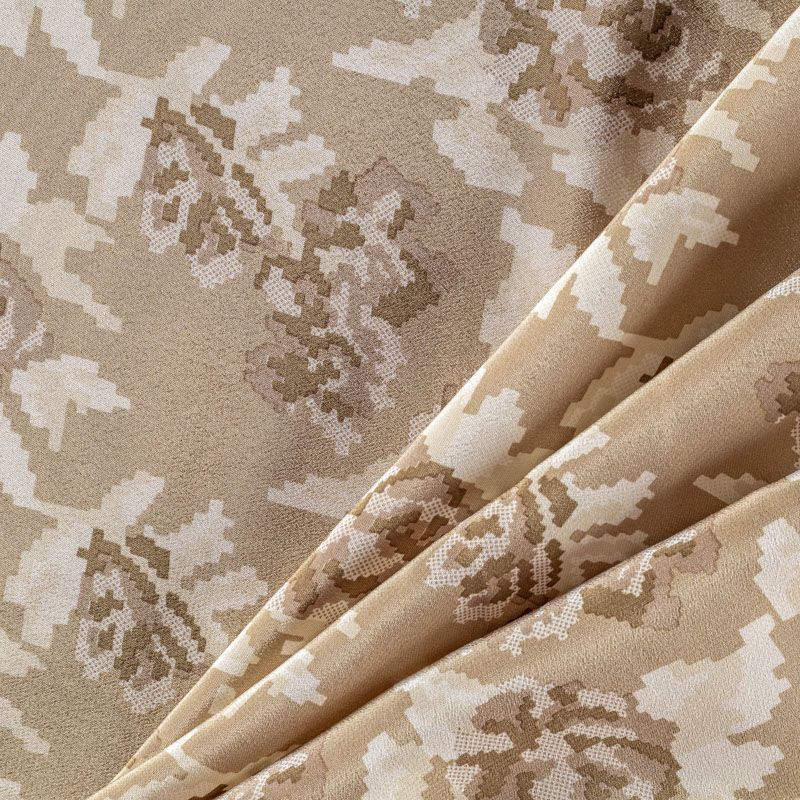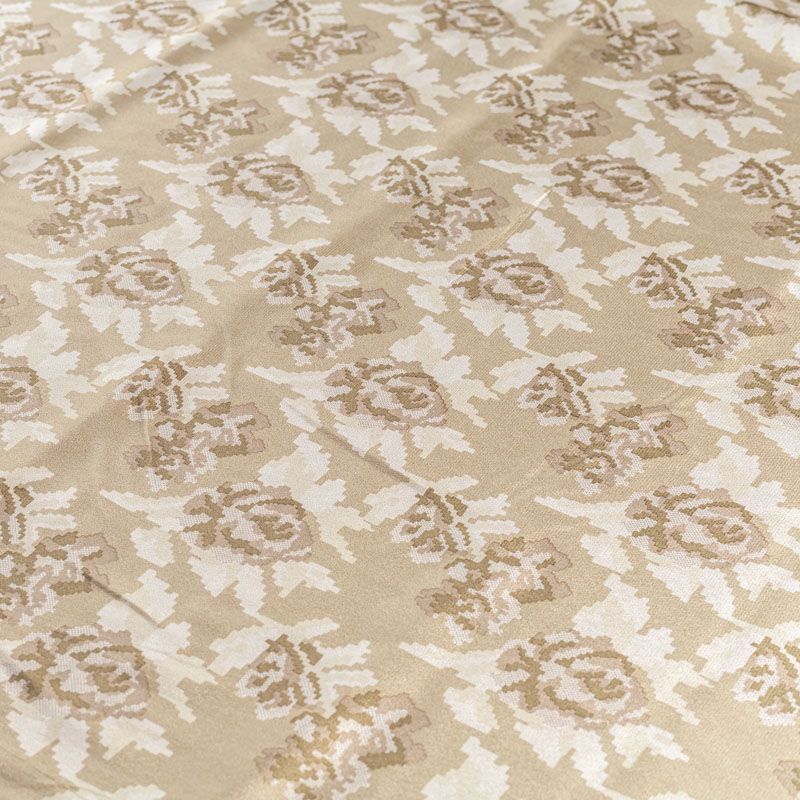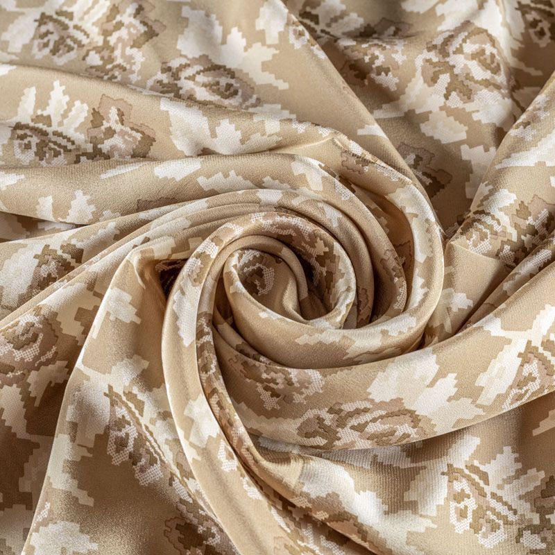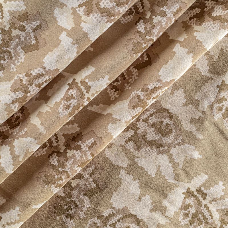 Натуральный шелковый крепдешин с матовой поверхностью, легкий, струящийся, хорошо драпируется. Цветочный принт выполнен в стиле пиксель-арт, который превращает его в абстрактный. Крепдешин прекрасно подойдет для пошива летнего сарафана, платья, блузки, костюма в пижамном стиле, широких брюк или юбки.