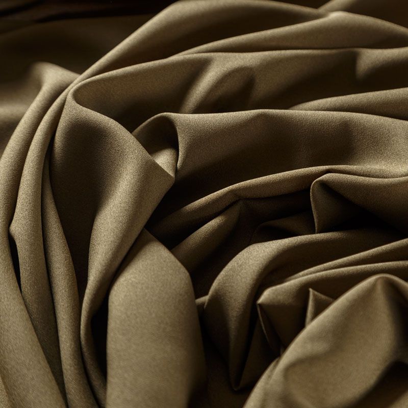 Крепдешин оттенка хаки, тонкий, легкий, фактурный, приятный на ощупь. Очень пластичный, тянется за счет эластана в составе, прекрасно драпируется и струится. Ткань слегка просвечивает, можно использовать подклад. Идеально будет смотреться в платье, юбке, тунике, рубашке или блузке.