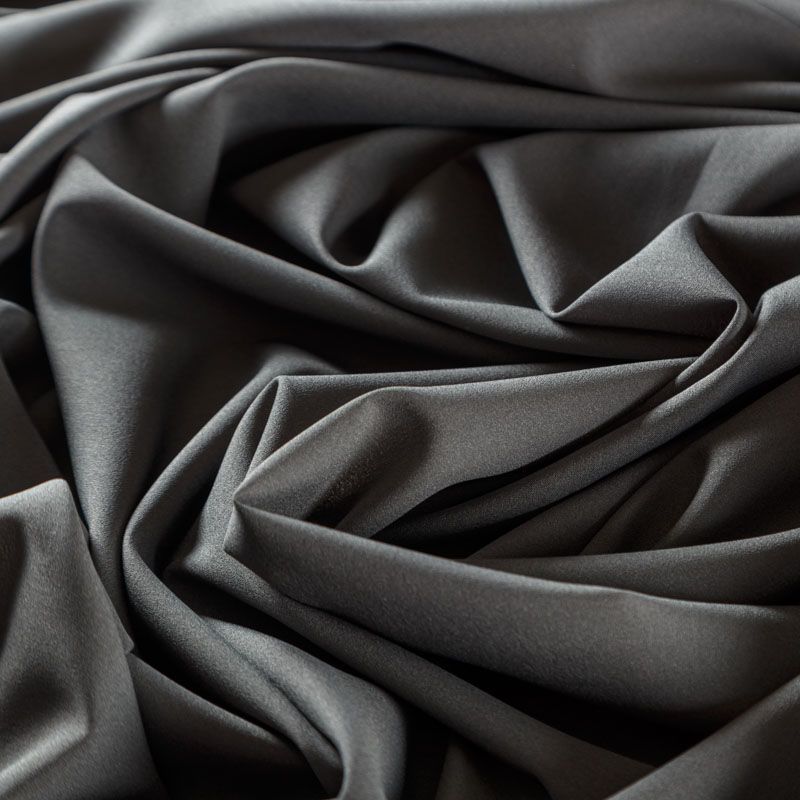 Крепдешин серого оттенка, тонкий, легкий, фактурный, приятный на ощупь. Очень пластичный, тянется за счет эластана в составе, прекрасно драпируется и струится. Ткань слегка просвечивает, можно использовать подклад. Идеально будет смотреться в платье, юбке, тунике, рубашке или блузке.