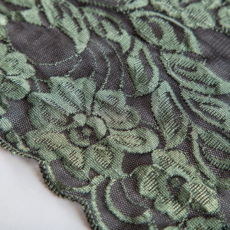 Эластичное кружево сочетает в себе мягкость, прочность и красоту, благодаря своей упругости оно долго не теряет первоначальную форму. Используется для пошива нижнего белья, а так же применяется как отделочный декор в одежде.