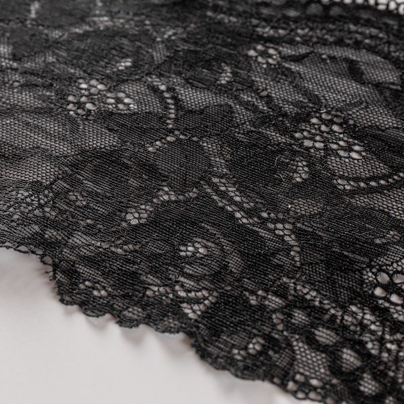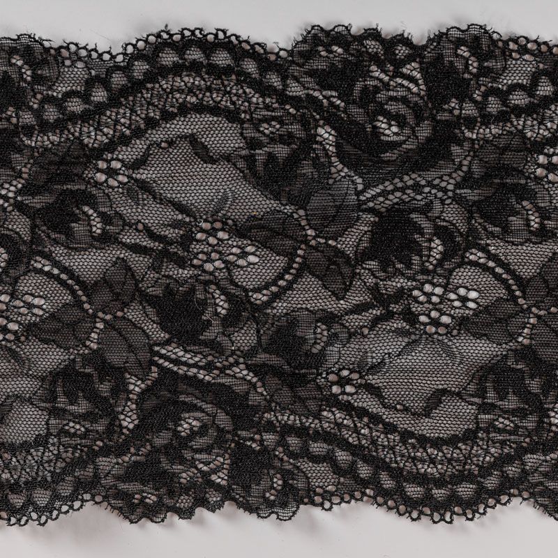 Эластичное кружево сочетает в себе мягкость, прочность и красоту, благодаря своей упругости оно долго не теряет первоначальную форму. Используется для пошива нижнего белья, а так же применяется как отделочный декор в одежде.