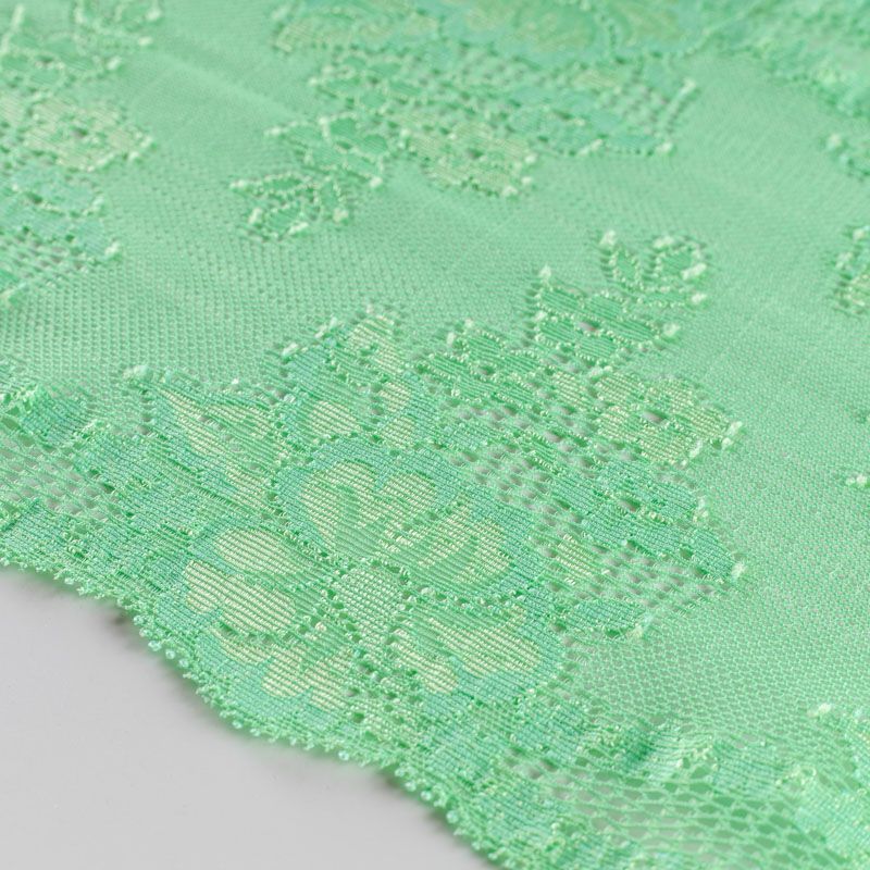 Эластичное кружево сочетает в себе мягкость, прочность и красоту, благодаря своей упругости оно долго не теряет первоначальную форму. Используется для пошива нижнего белья, а так же применяется как отделочный декор в одежде.