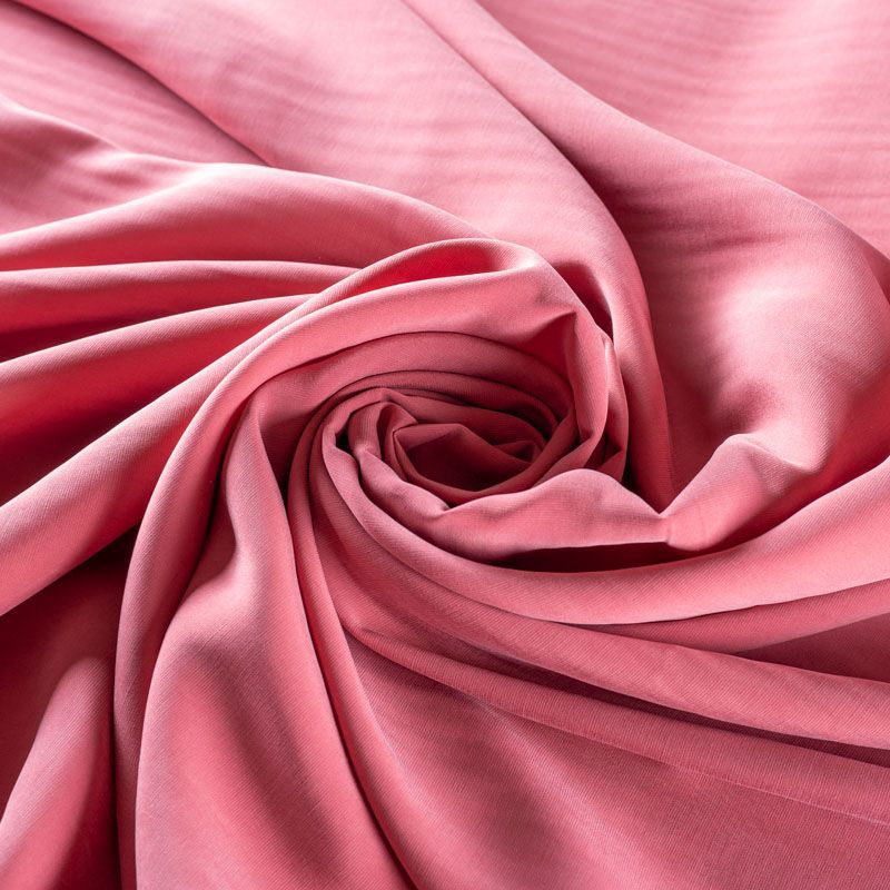 Купро плательно-костюмной плотности розового оттенка. Ткань мягкая, пластичная, струящаяся, отлично драпируется, не просвечивает. Поверхность ткани бархатистая, похожа на мокрый шелк. Идеально подойдет для платьев свободного силуэта, брюк-палацио, юбок, шорт, туник, платья-рубашки, блузы.