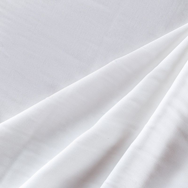 Купро плательно-костюмной плотности белого оттенка. Ткань мягкая, пластичная, струящаяся, отлично драпируется, не просвечивает. Поверхность ткани бархатистая, похожа на мокрый шелк. Идеально подойдет для платьев свободного силуэта, брюк-палацио, юбок, шорт, туник, платья-рубашки, блузы.