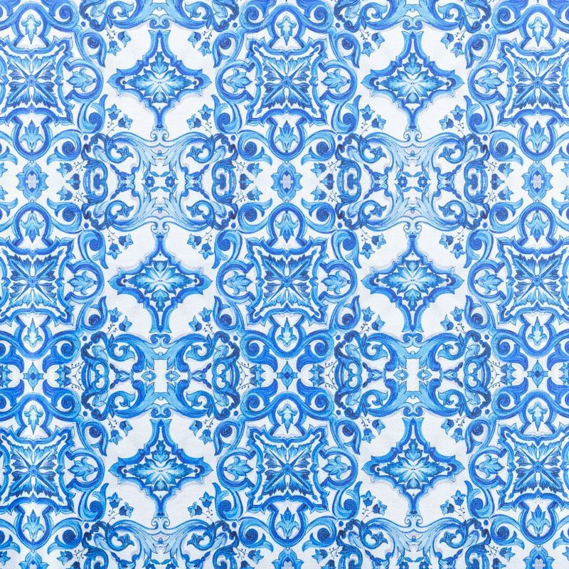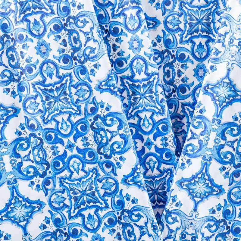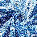 Итальянский бифлекс с орнаментом в сине-голубых оттенках. Поверхность ткани матовая и гладкая. Отлично тянется, одежда из него не сковывает движения. Хорошо впитывает влагу и быстро высыхает, не вызывет аллергии и раздражения. Используется для пошива эстрадных, спортивных костюмов, купальников, боди.