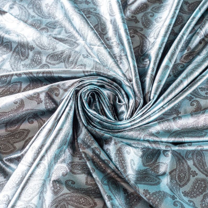 Итальянский бифлекс с монохромным орнаментом пейсли. Поверхность ткани с блеском и гладкая. Отлично тянется, одежда из него не сковывает движения. Хорошо впитывает влагу и быстро высыхает, не вызывет аллергии и раздражения. Используется для пошива эстрадных, спортивных костюмов, купальников, боди.