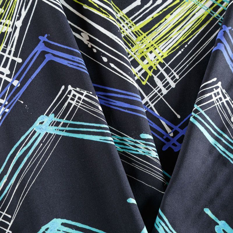 Итальяская качественная, красивая и приятная на ощупь лайкра черного цвета со стильным абстактным принтом в ярких неоновых оттенках. Поверхность ткани матовая и гладкая. Идеально облегает фигуру, тянется по двум направлениям, хорошо драпируется, отлично держит форму, устойчива к пилингу, долговечна и гигроскопична. Используется для пошива одежды для танцев, гимнастики, фигурного катания, для велоспорта, легкой атлетики и аэробики, фитнеса и других видов спорта, для купальников, женского белья, театральных, цирковых и эстрадных костюмов.