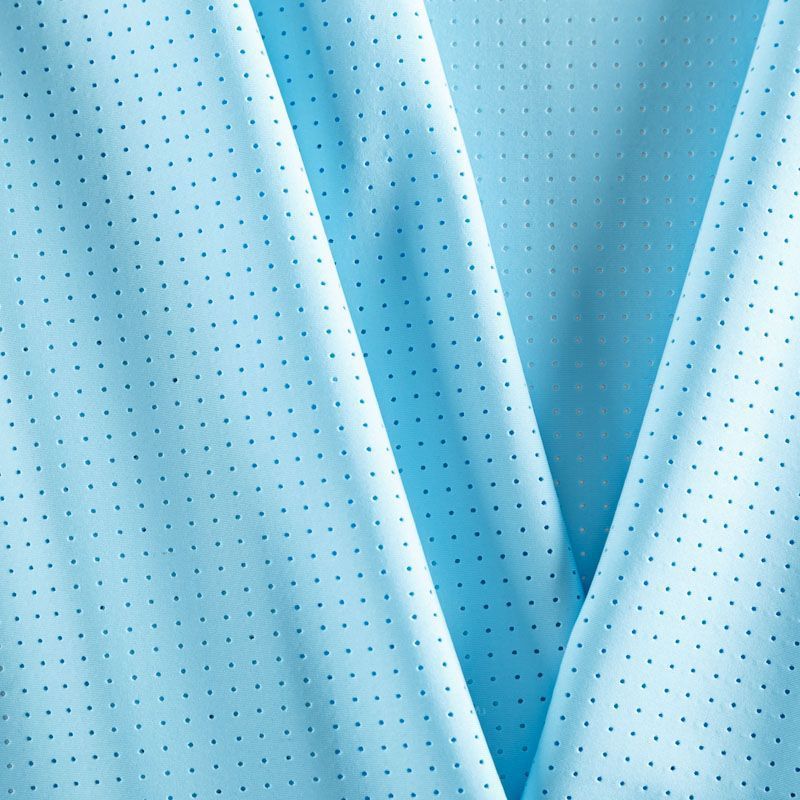 Итальяская качественная, красивая и приятная на ощупь лайкра с перфорацией голубого оттенка. Поверхность ткани матовая, гладкая, шелковистая на ощупь. Идеально облегает фигуру, тянется по двум направлениям, хорошо драпируется, отлично держит форму, устойчива к пилингу, долговечна и гигроскопична. Используется для пошива одежды для танцев, гимнастики, фигурного катания, для велоспорта, легкой атлетики и аэробики, фитнеса и других видов спорта, для купальников, женского белья, театральных, цирковых и эстрадных костюмов.