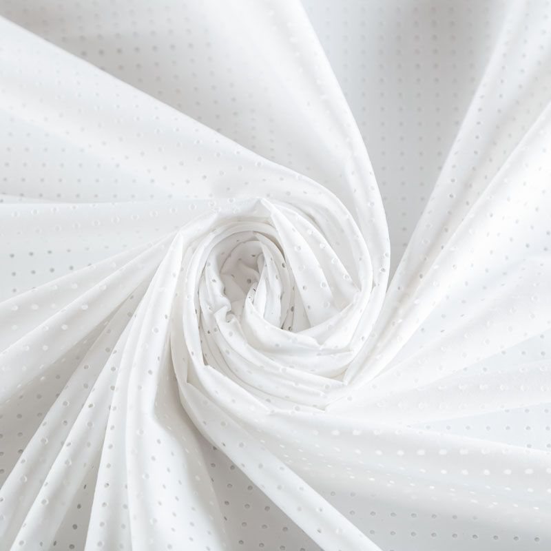Итальяская качественная, красивая и приятная на ощупь лайкра с перфорацией молочного оттенка. Поверхность ткани матовая, гладкая, шелковистая на ощупь. Идеально облегает фигуру, тянется по двум направлениям, хорошо драпируется, отлично держит форму, устойчива к пилингу, долговечна и гигроскопична. Используется для пошива одежды для танцев, гимнастики, фигурного катания, для велоспорта, легкой атлетики и аэробики, фитнеса и других видов спорта, для купальников, женского белья, театральных, цирковых и эстрадных костюмов.
