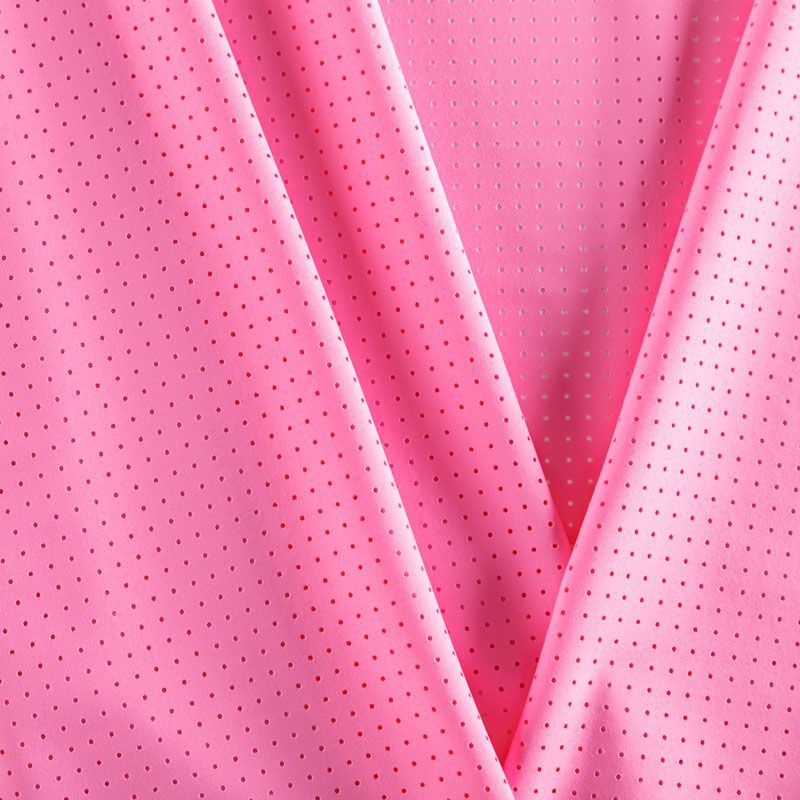 Итальяская качественная, красивая и приятная на ощупь лайкра с перфорацией ярко-розового оттенка. Поверхность ткани матовая, гладкая, шелковистая на ощупь. Идеально облегает фигуру, тянется по двум направлениям, хорошо драпируется, отлично держит форму, устойчива к пилингу, долговечна и гигроскопична. Используется для пошива одежды для танцев, гимнастики, фигурного катания, для велоспорта, легкой атлетики и аэробики, фитнеса и других видов спорта, для купальников, женского белья, театральных, цирковых и эстрадных костюмов.