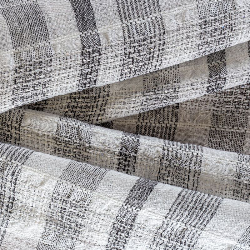 Итальянский лен с добавлением вискозы средней плотности со сложной "клетчатой" геометрией в черно-белых оттенках декорирован мелкими пайетками. Различная толщина нитей создает эффектную фактуру. Ткань пластичная, гибкая за счет плетения, матовая, мягкая, приятная на ощупь, не рыхлая, комфортная в изделии. Отлично подойдет для пошива летних костюмов, рубашек, туник, платьев, сарафанов, юбок, жакетов, брюк или шорт, легкого пальто.