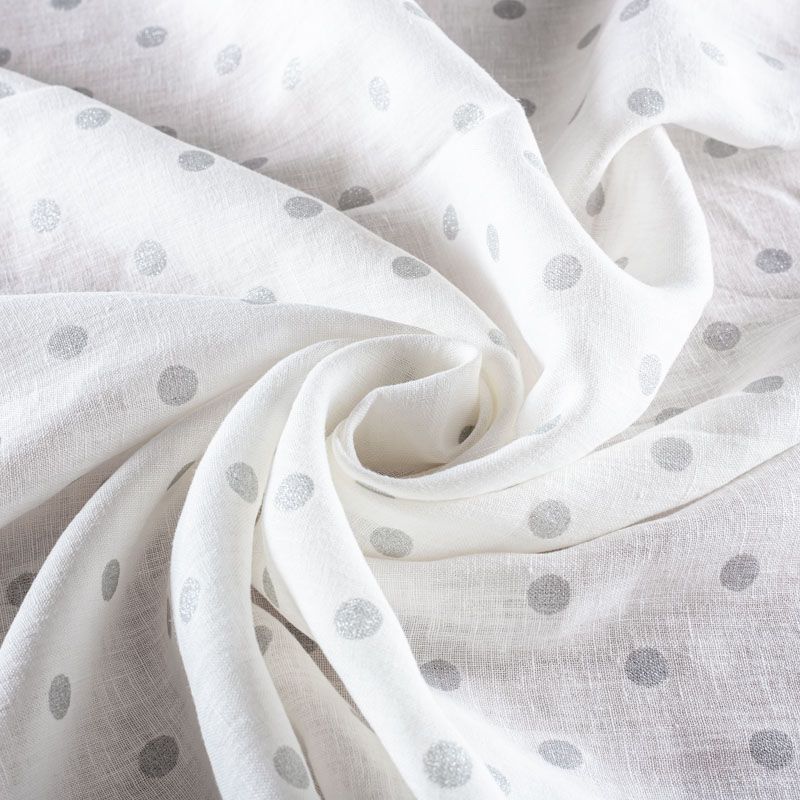 Итальянский лен плательно-рубашечный лен с классическим принтом "в горох", который декорирован серебристым напылением. Ткань прочная, имеет матовую рельефную поверхность и полотняное переплетение, отлично держит форму, не много просвечивает, пластичная, комфортная в изделии. Отлично подойдет для пошива для летних костюмов, рубашек, туник, платьев, сарафанов, юбок, жакетов, брюк или шорт.
